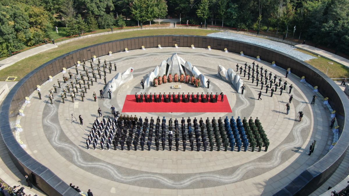 9月28日,第七批在韩中国人民志愿军烈士遗骸安葬仪式在沈阳抗美援朝烈士陵园举行(无人机照片)。
