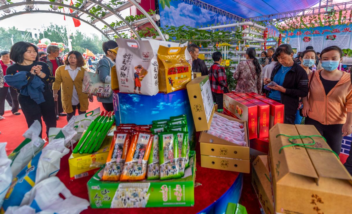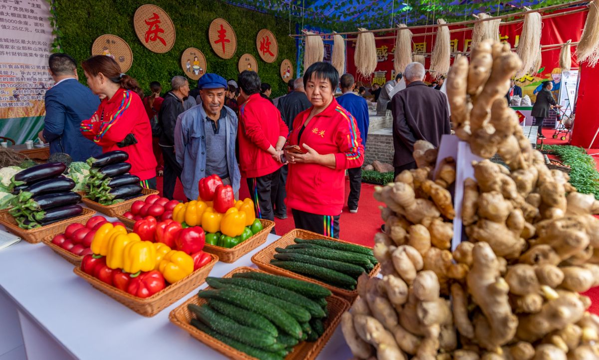 丰收的美景是用汗水浇灌而来的。当天的新绛县荀子广场,该县各乡镇使出浑身解数、拿出看家本领,各展区的一排排货架上摆满了各式各样、五彩缤纷的瓜果蔬菜,前来参观购买的人群络绎不绝。