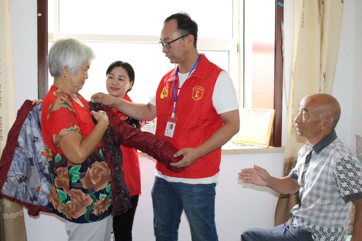 中秋佳节来临之际,闻喜县南城社区桐香苑小区居民梁永禄(右二),来到该县宽峪村贫困户朱秀珍家里,为其送来捐赠的衣物。 特约摄影 刘佳