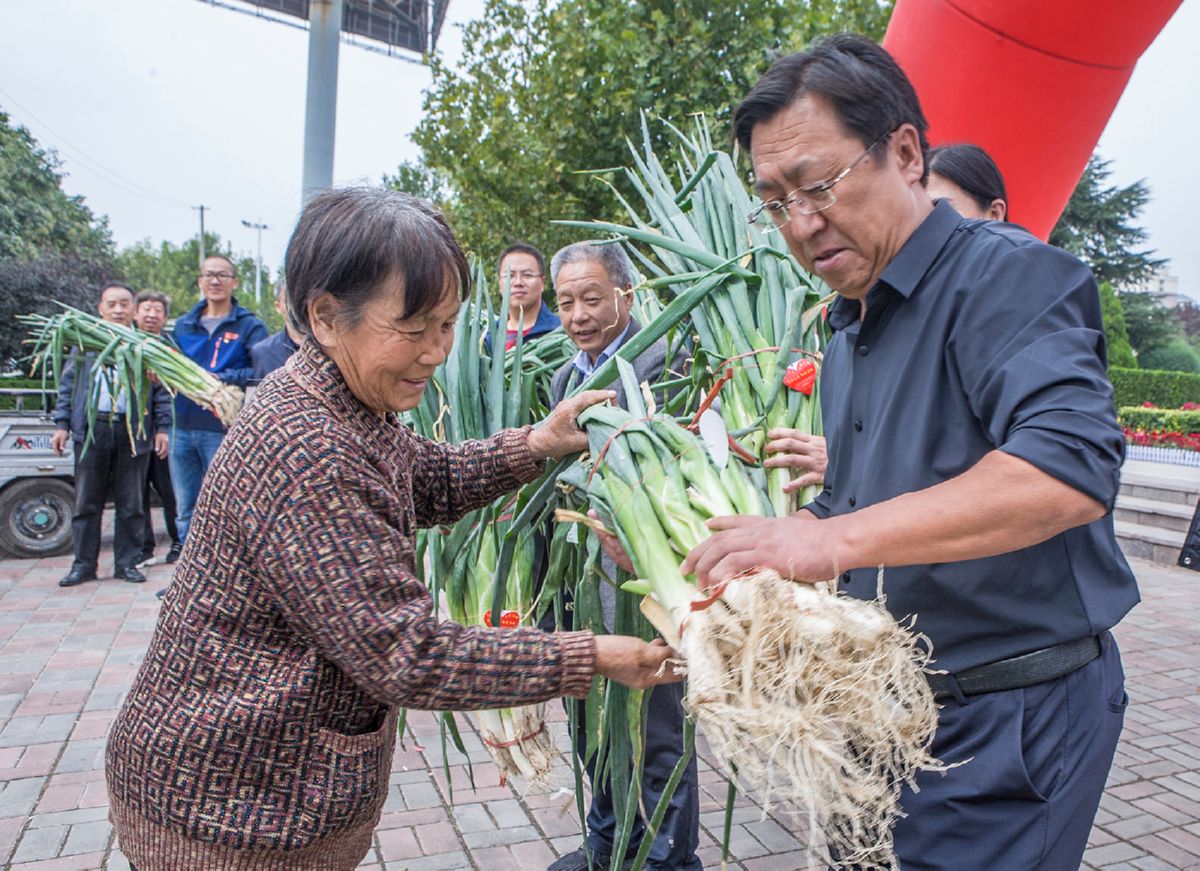 ▲9月30日,万荣县宝鼎社区华荣网格党支部的党员,在认购贫困户杨变变的大葱。