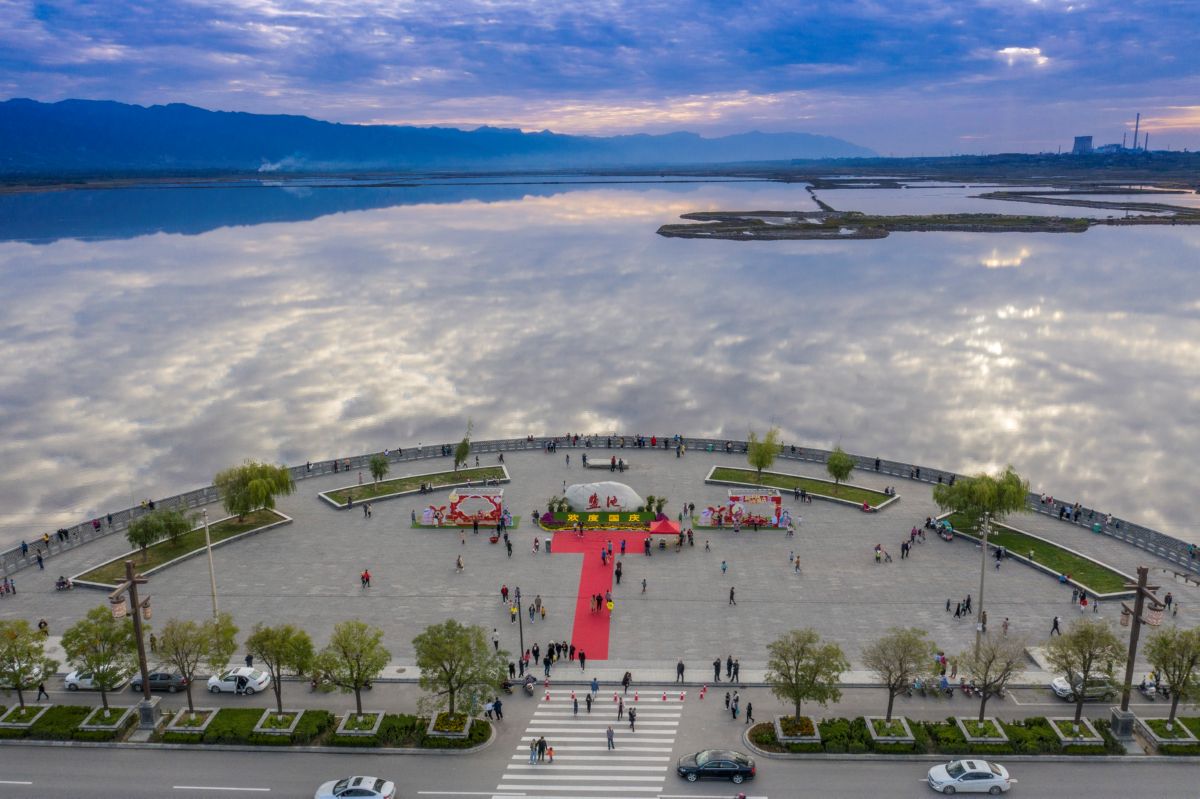 10月4日,盐湖观景台前,漫天的云彩与连绵的条山倒映盐湖,仿佛人间仙境,吸引了众多游客拍照、观景。