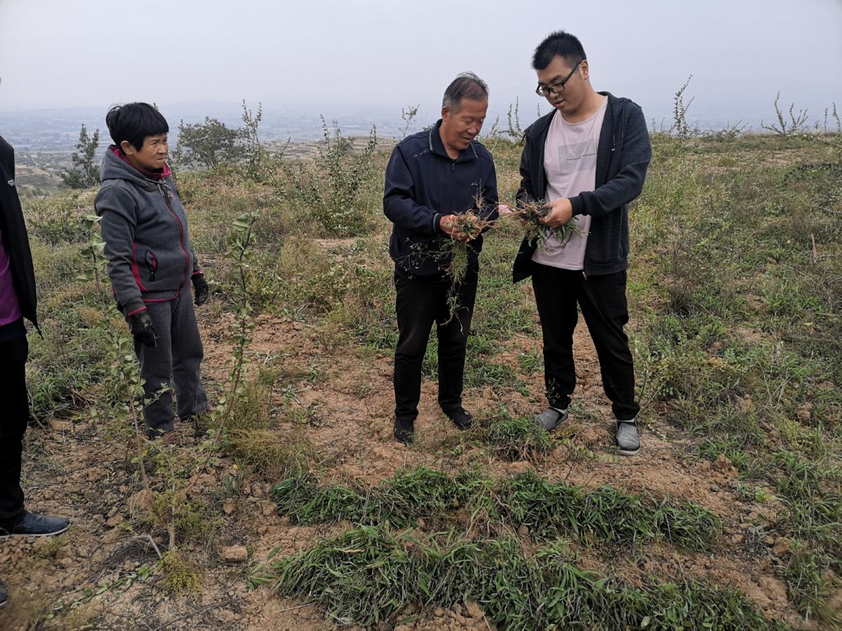 ▲绛县人民医院驻山底坡村第一书记徐森和村干部在查看柴胡的生长情况。 裴旭薇 摄