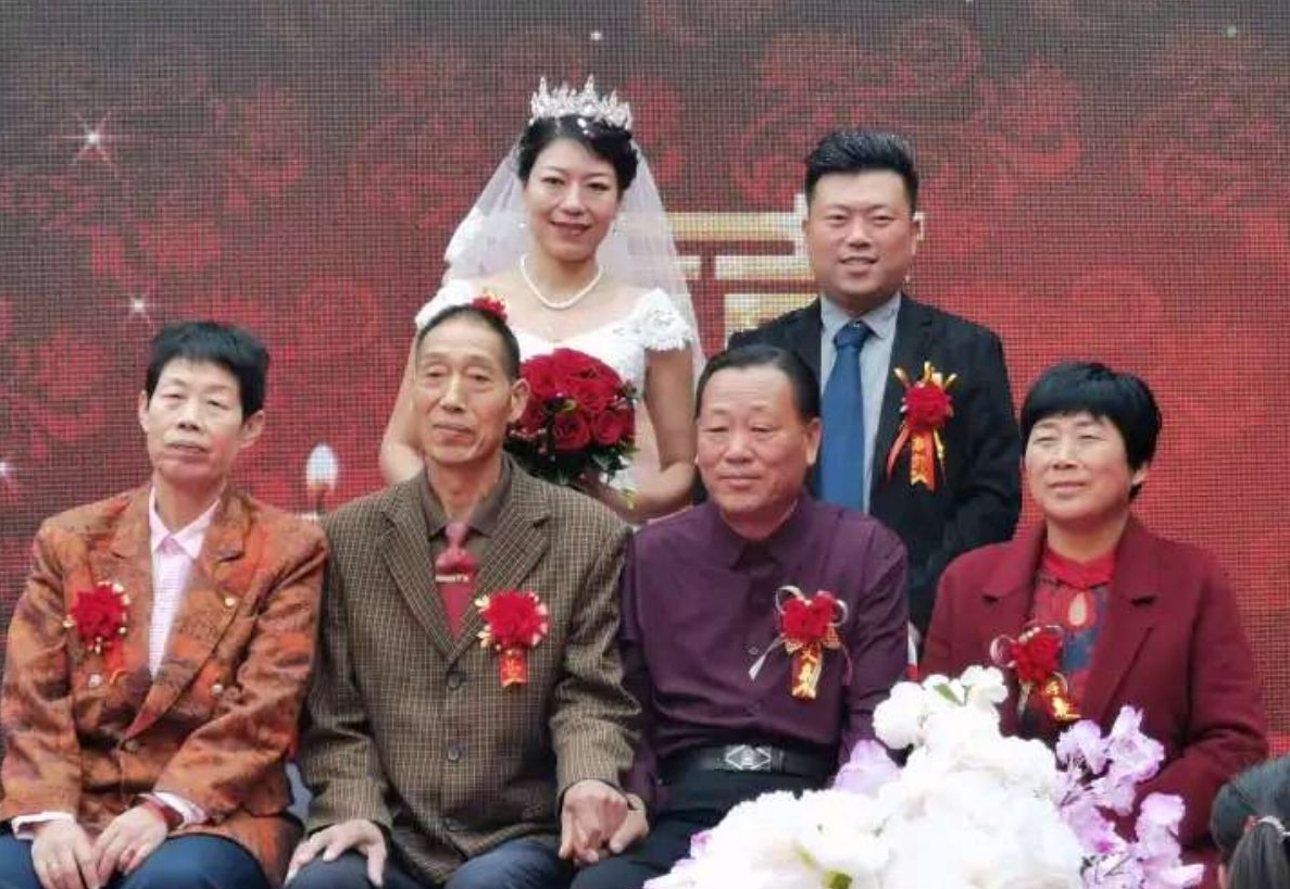 ▲新郎张祥(后排右)、新娘黄莺(后排左)与双方父母合影