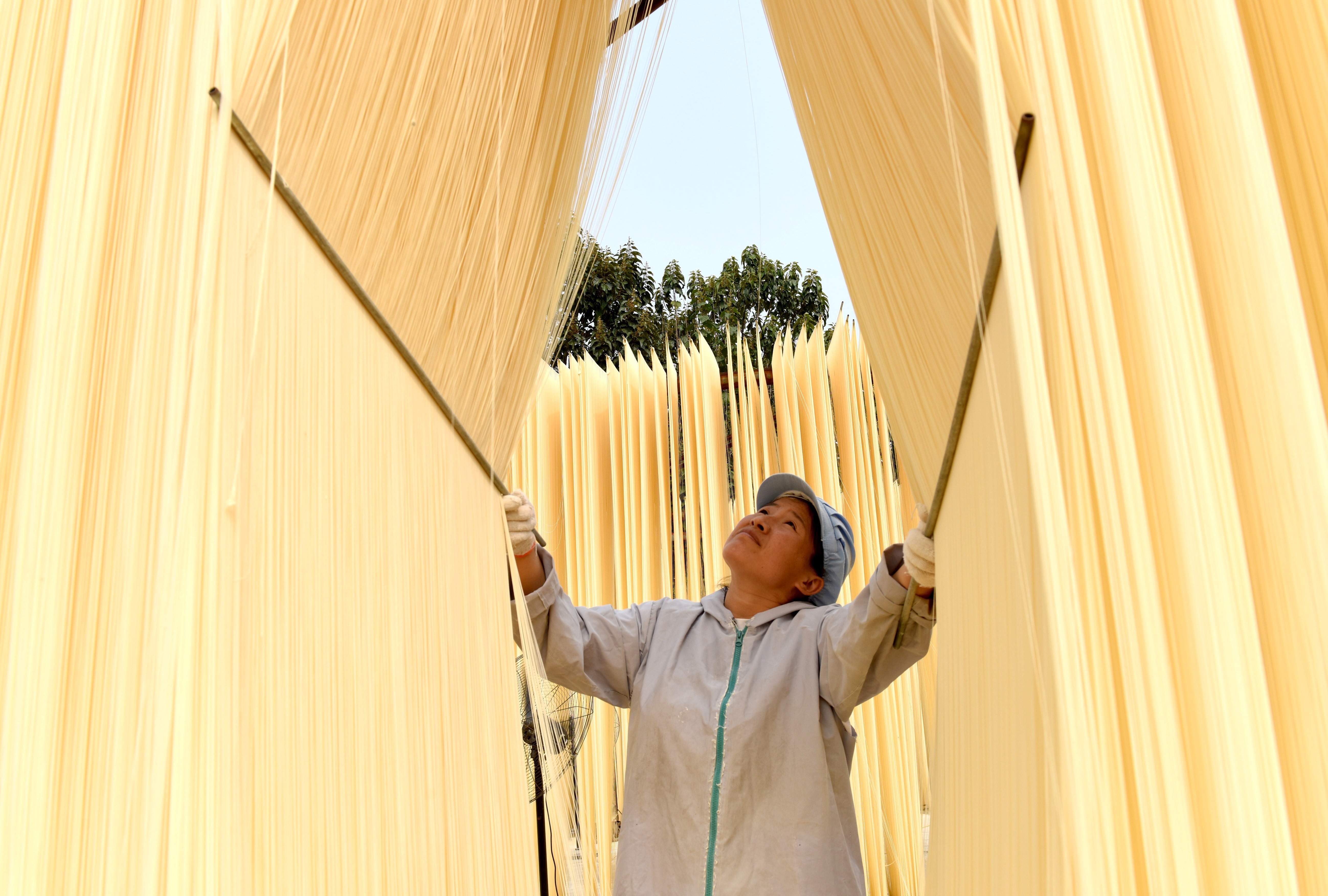 10月12日,威县梨园屯镇东赵村村民在挂面作坊晾晒手工挂面。