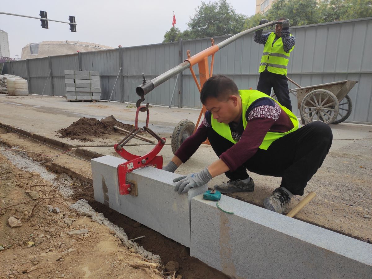 市政工人在铺设路缘石 祁克宁 摄