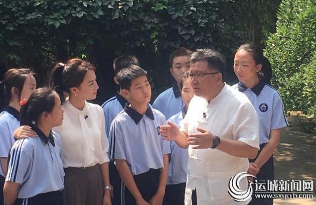 ▲解州关帝庙文物保管所所长卫龙(右二)向节目主持人张小文(左三)和理想学校学生讲解关公文化