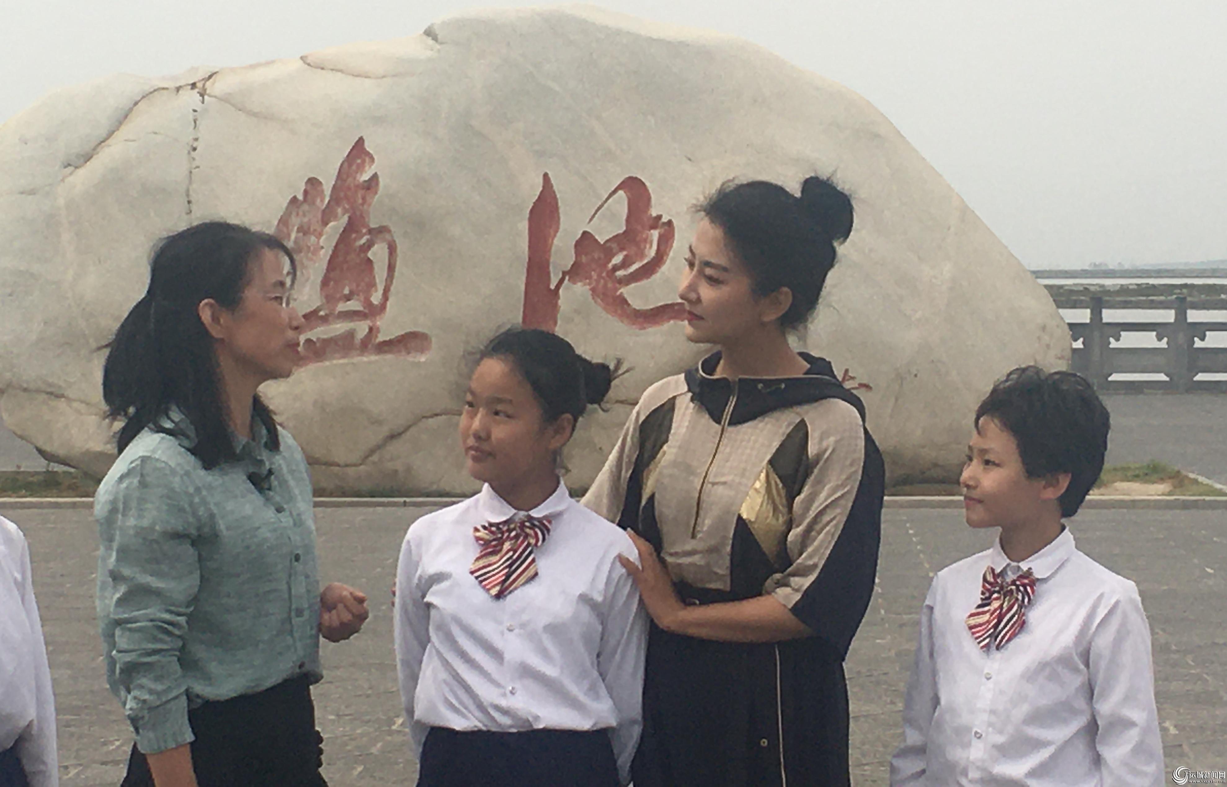 ▲河东盐业博物馆馆长尹冰(左一)向节目主持人马笑舒(右二)和钱学森科技小学学生介绍盐文化
