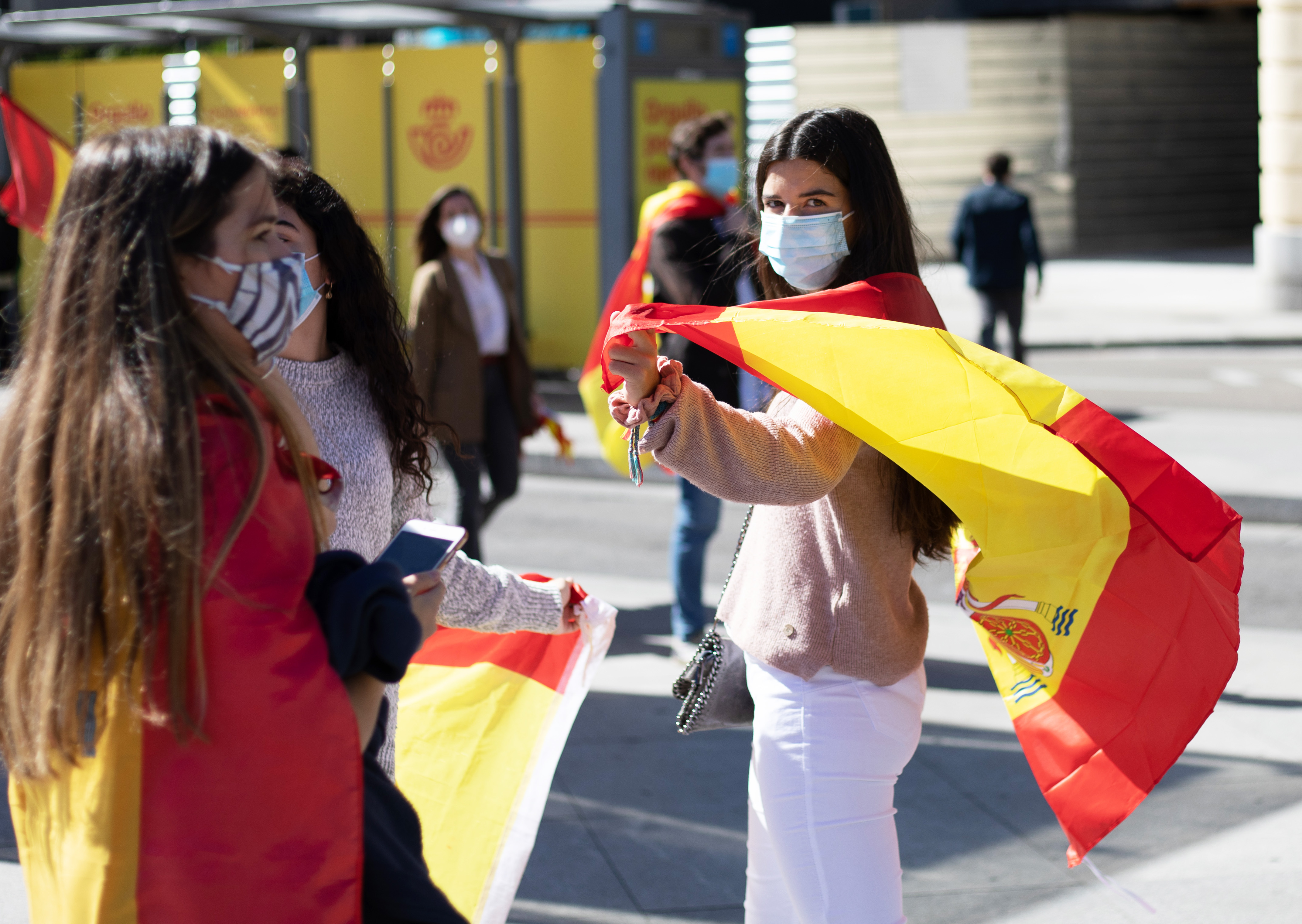 10月12日,人们在西班牙马德里佩戴口罩参加国庆日活动。当日是西班牙国庆日,受疫情影响,取消部分大型庆祝活动,但仍有大批民众自发走上街头庆祝。( 孟鼎博 摄)