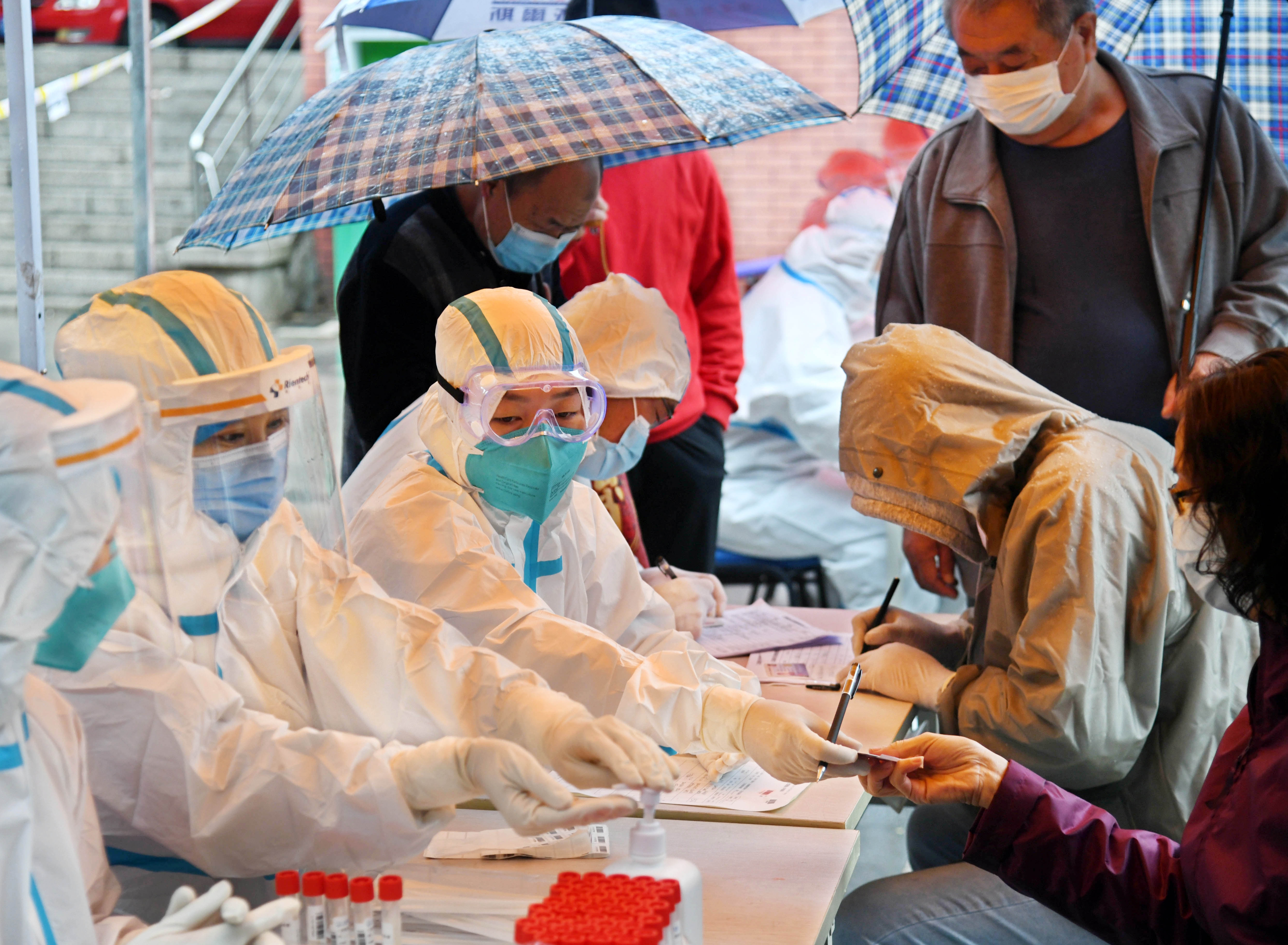 ▶10月14日,市民在青岛市市北区东莞路文化广场检测点登记进行核酸检测采样。