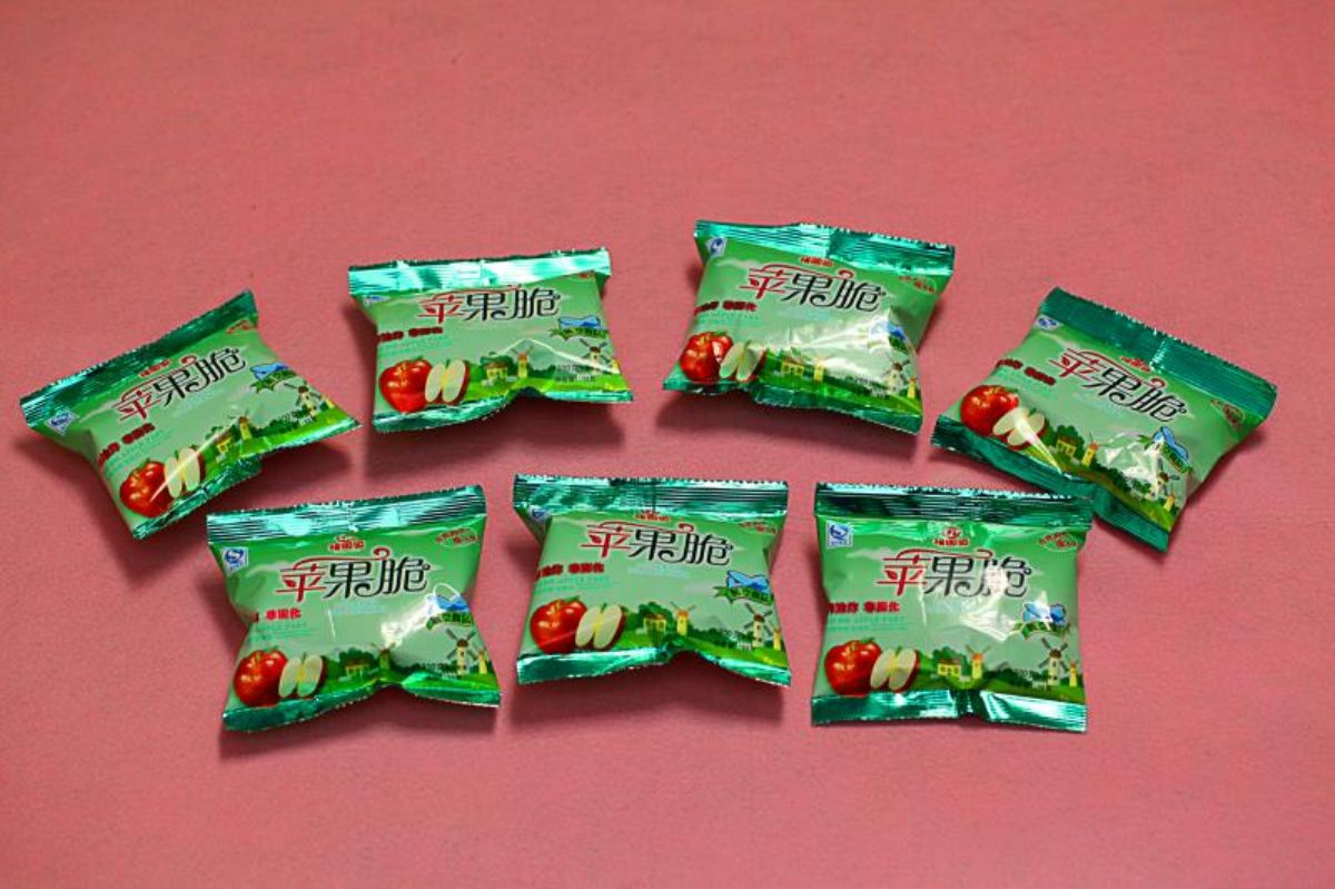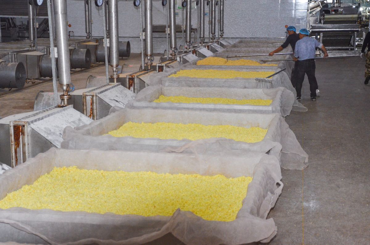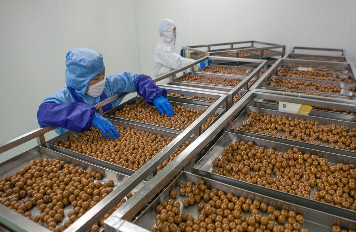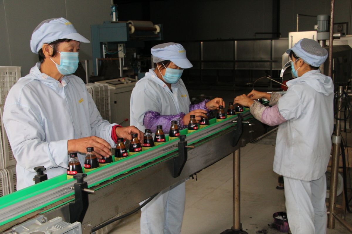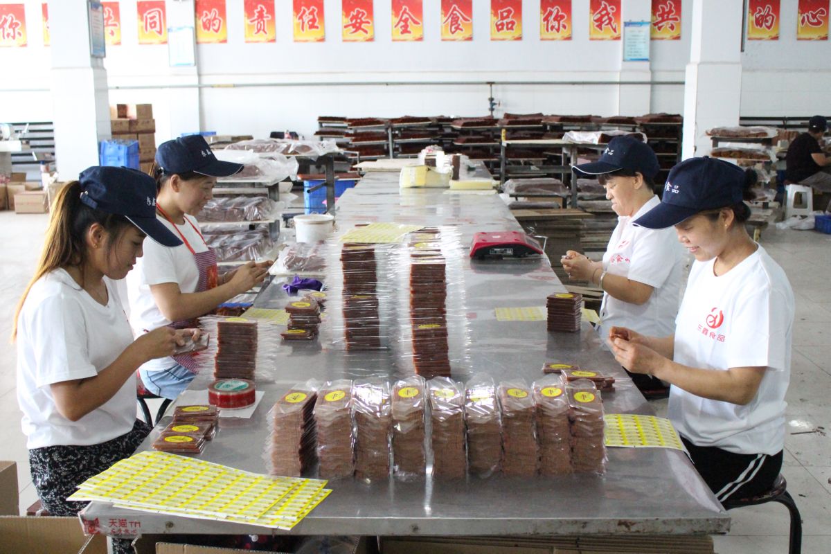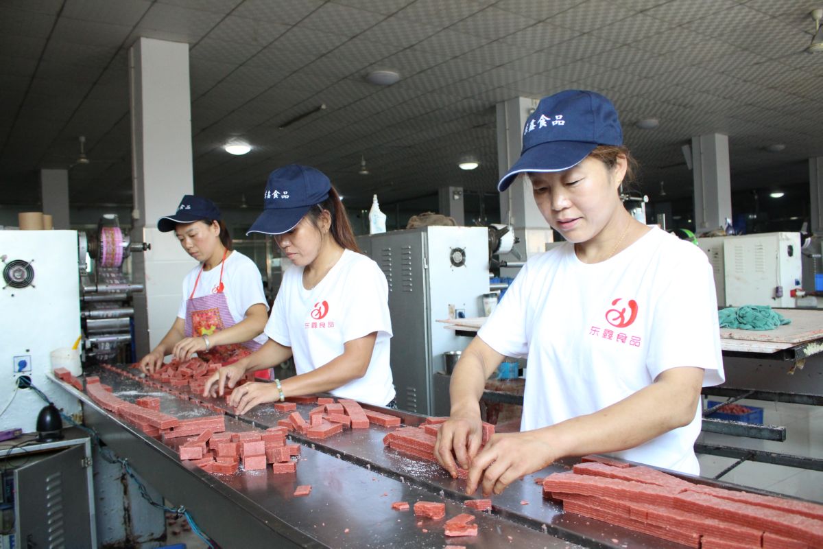 ▲万荣喜凌果汁食品有限公司的工人在加工果圈
