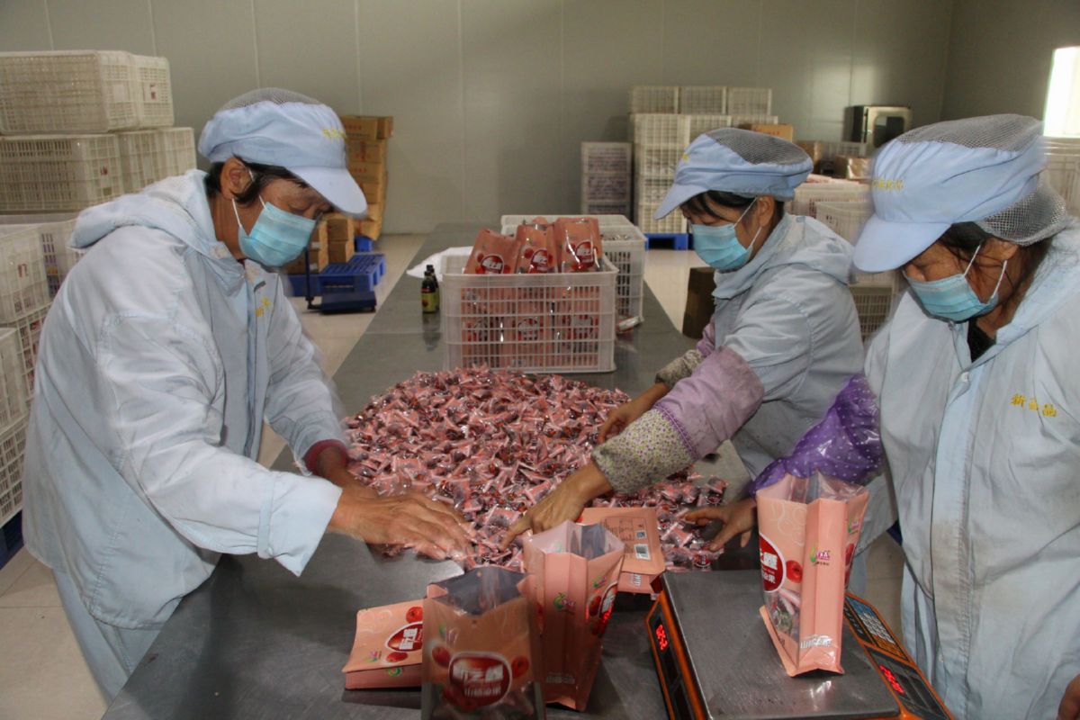 ▲万荣县贾村乡国红果库的工人在加工果丁