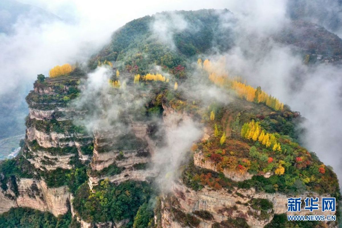 ▲10月14日,雨后的河南安阳林州太行大峡谷,层林尽染,云雾缭绕,如诗如画,宛若仙境。树叶红的胜火,黄的似金,绿如翡翠,远山层峦叠嶂,近村安静祥和,这一刻,太行秋景入画来。(新华社10.15)