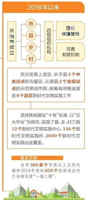 2018年以来,长治市深入推进新时代文明实践工作,完善组织架构,明确市级指导、县级统筹、乡村两级落实的工作模式,在市县乡村四级设置组织机构,强化保障措施,完善制度机制,充分发挥上党区、长子县2个中央试点和屯留区、沁源县2个省级试点的示范带动作用,统筹有序推进其余8个县区新时代文明实践工作。坚持阵地建设“十有”标准,以“五大平台”为依托,实现了县、乡、村三级12个新时代文明实践中心、146个新时代文明实践所、2600个新时代文明实践站全覆盖