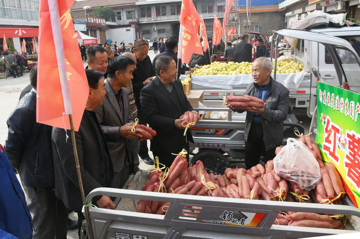 10月19日,在闻喜县河底镇兴河市场院内,蜂蜜、红薯、花椒、苹果、大葱等特色农产品吸引了周边群众前来挑选购买。