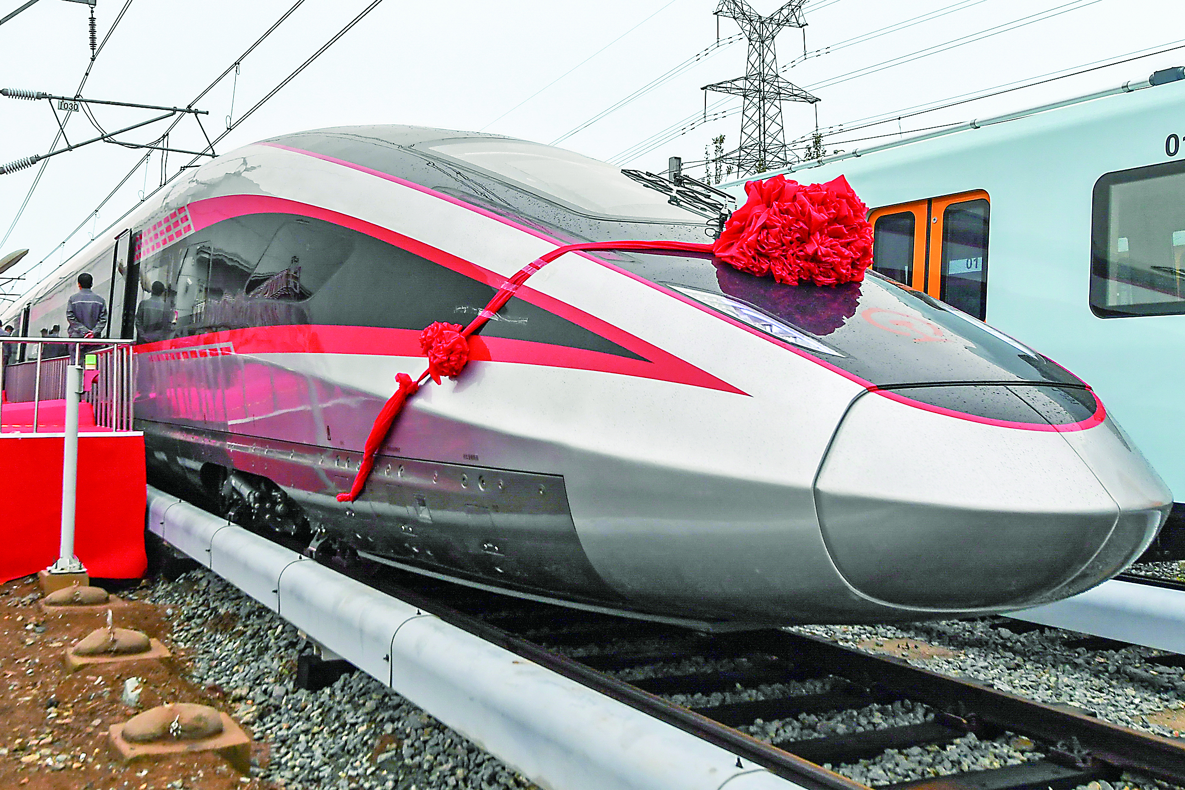 当日,我国自主研发的时速400公里跨国互联互通高速动车组,在中车长春轨道客车股份有限公司下线。列车可在不同气候条件、不同轨距、不同供电制式标准的国际铁路间运行,能让国际、洲际旅行更便捷。(记者 张楠 摄)
