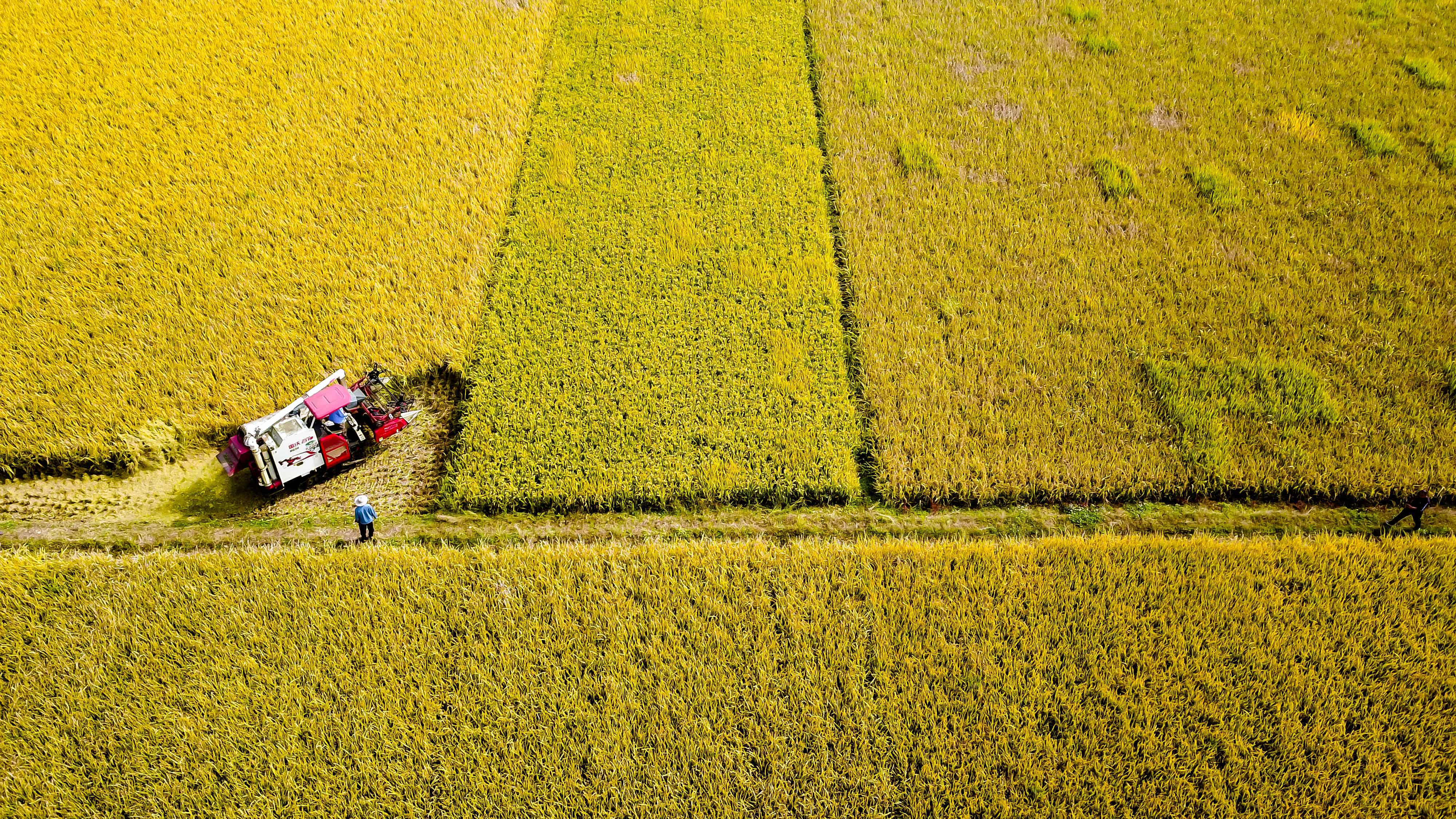 金秋时节,有着运河古城、江北水乡美誉的山东省枣庄市台儿庄区两万余亩水稻进入成熟收获期,田野一片金黄,稻农开始忙碌收割水稻,呈现出美丽的田园风光。(记者 郭绪雷 摄)