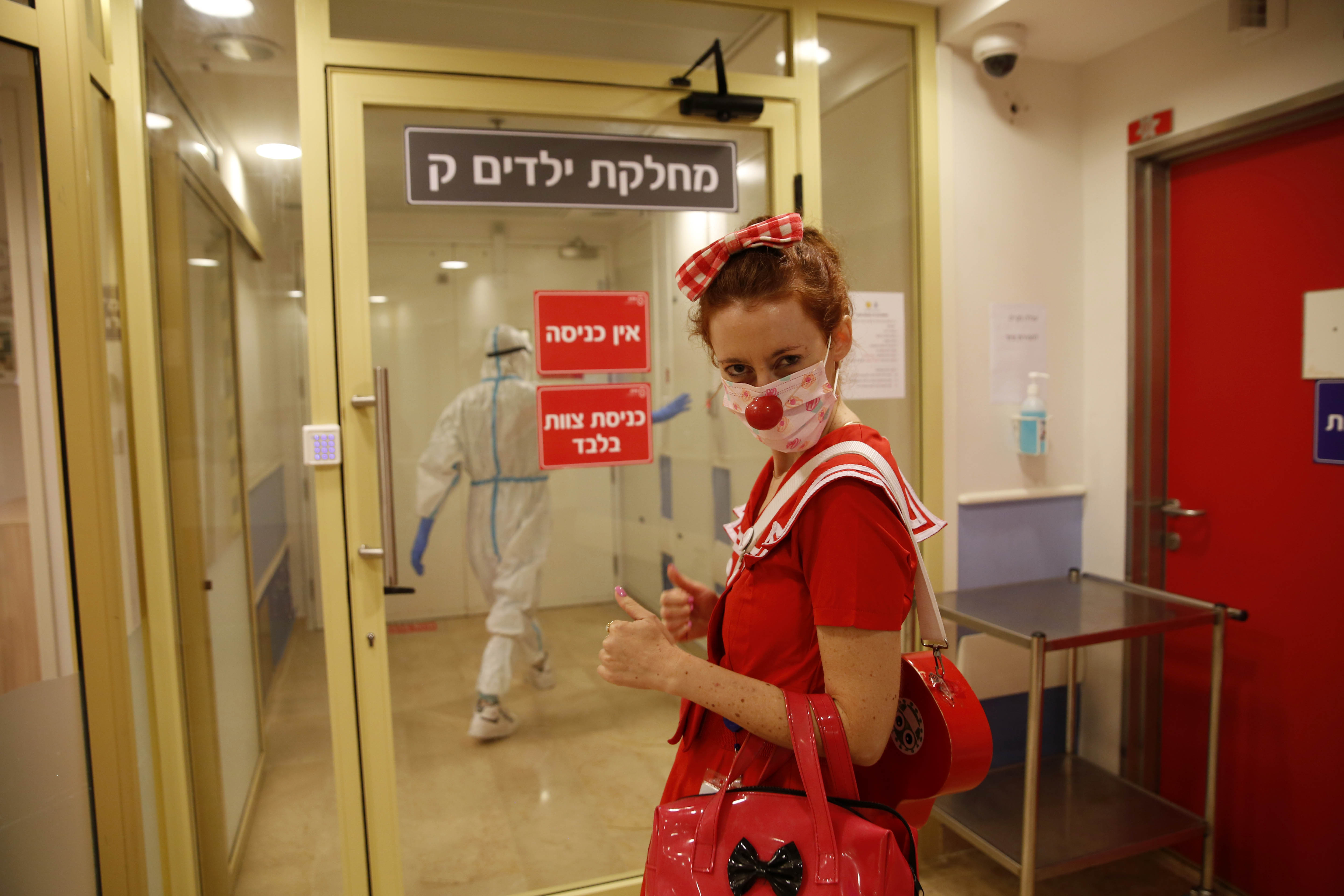 疫情期间,以色列医院有一群被称为“医疗小丑”“梦想医生”的人们,他们一身滑稽装扮,佩戴涂鸦口罩、动作夸张,希望帮助患者在欢笑中配合治疗,他们在严格的卫生防疫措施下坚持工作。(吉尔·科恩·马根 摄)