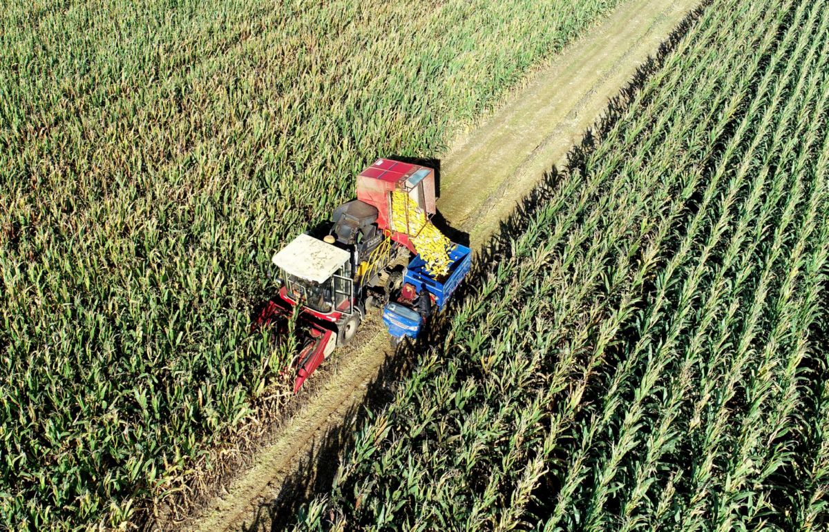 10月21日,稷山县玉丰农机专业服务合作社的农机手在给农业生产托管农户收割玉米。