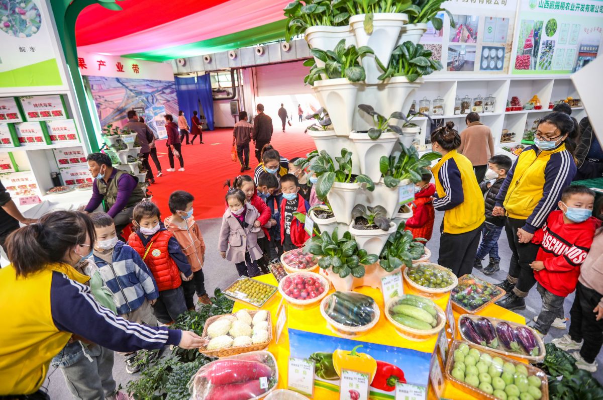 10月22日,第五届果博会新绛县展厅内,盐湖区一家幼儿园的老师在为孩子们介绍有机蔬菜。 记者 金玉敏 摄