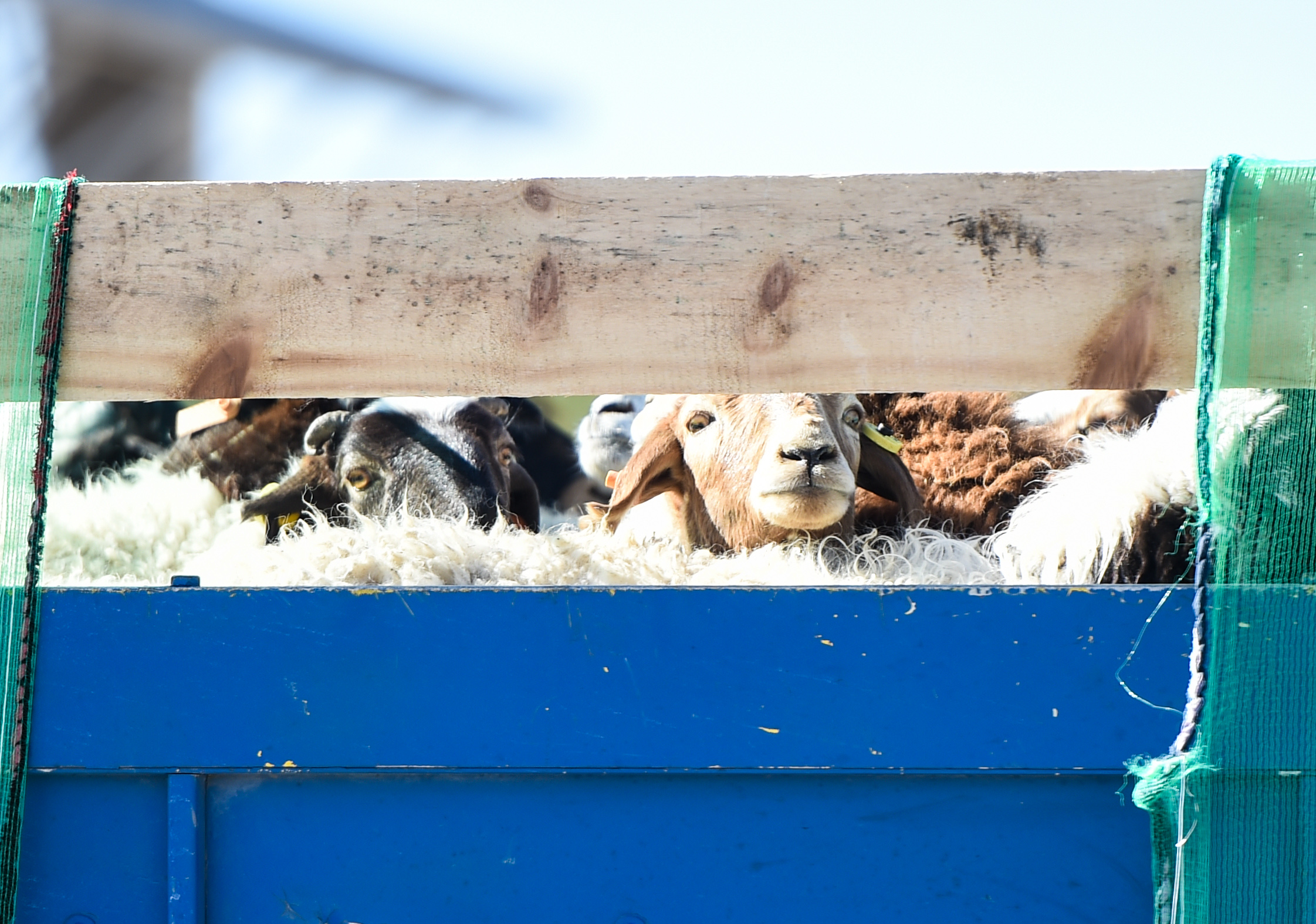 这是10月22日在内蒙古二连浩特口岸拍摄的蒙古国捐赠的羊(记者 彭源 摄)
