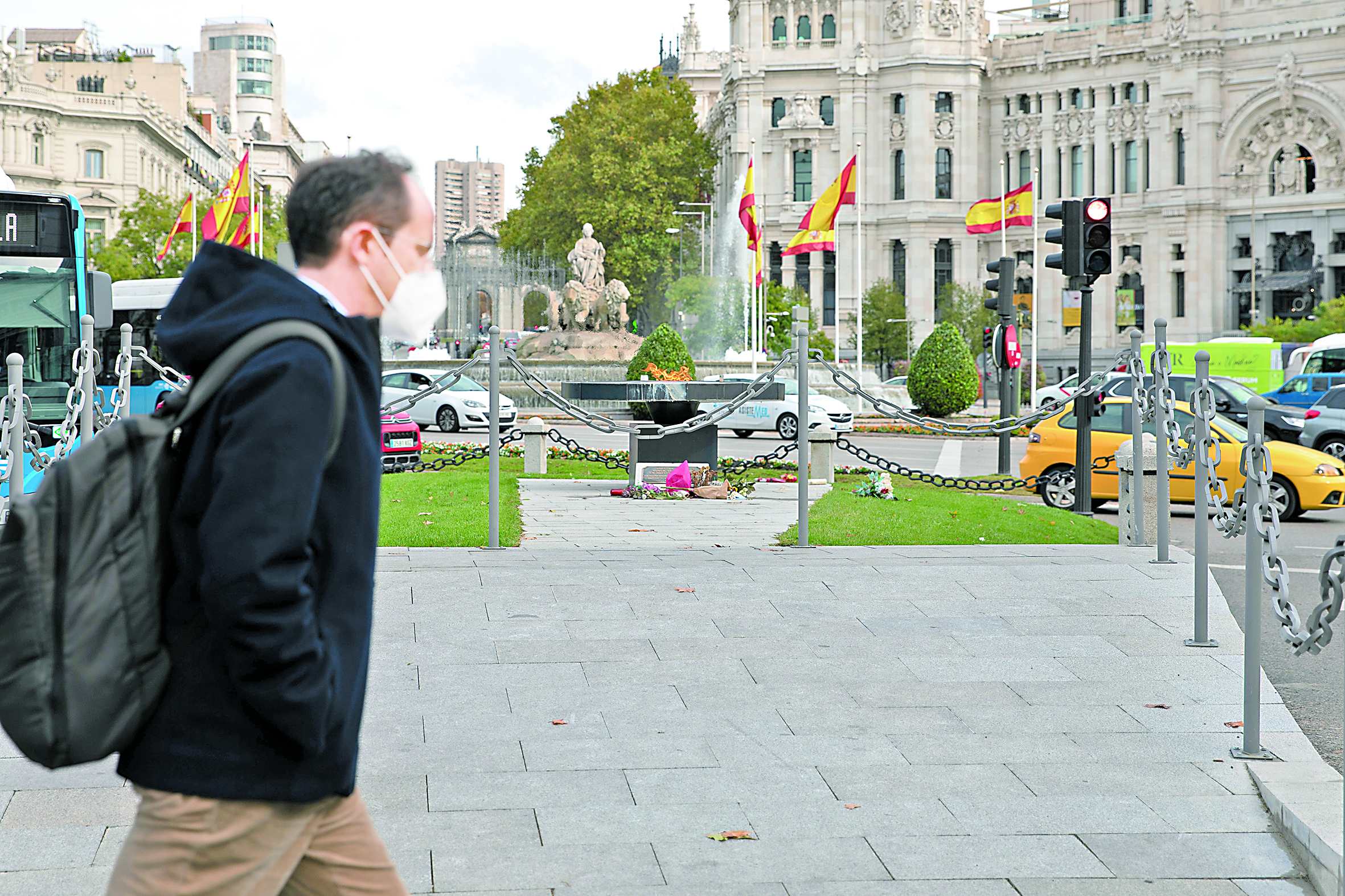 10月21日,在西班牙马德里,行人佩戴口罩经过新冠病亡者纪念火炬。西班牙卫生部21日发布数据,该国累计新冠确诊病例1005295例、死亡34366例。 (记者 孟鼎博 摄)