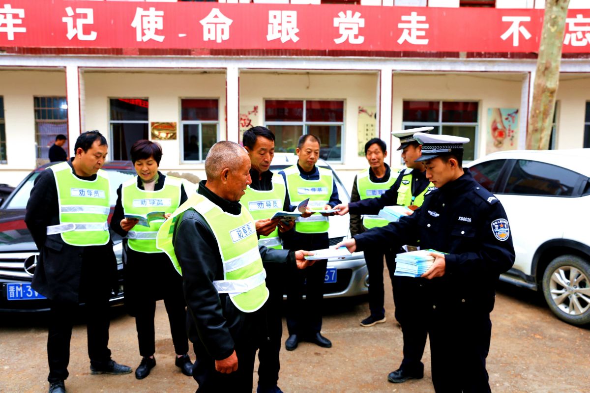 10月19日,夏县公安局交通管理大队民警在瑶峰镇为村干部发放交通安全劝导员标志服和《城乡居民交通安全》手册。