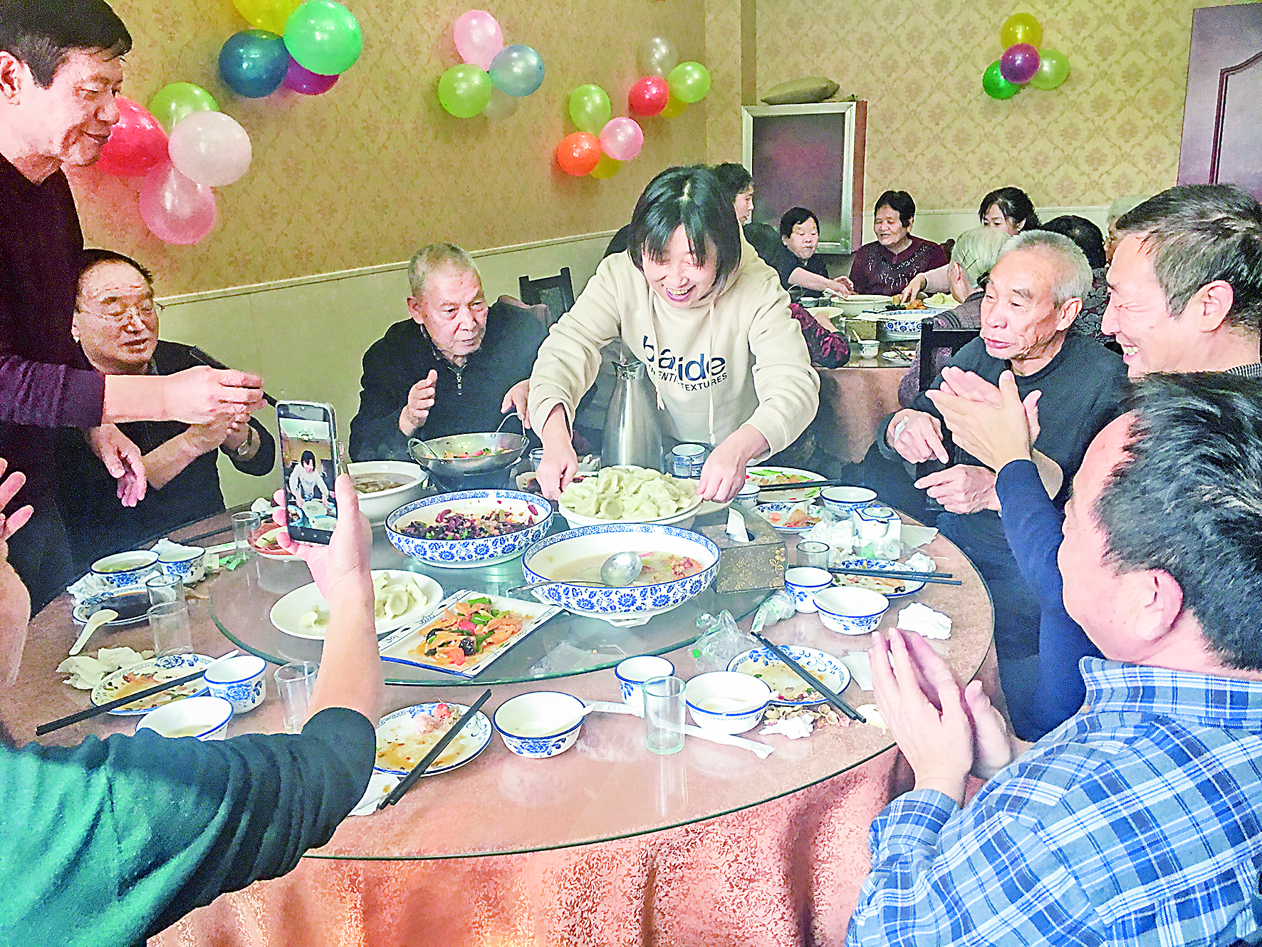 当日上午10时许,活动现场欢声笑语,十分热闹。物业工作人员、小区居民、志愿者齐聚一堂,他们有的和面,有的擀饺子皮,有的包饺子。大家一边干活一边拉家常。包完饺子,社区工作人员和物业工作人员安排老人就座,给他们端菜、倒水,盛上热气腾腾的饺子,送上一句句暖心的问候。