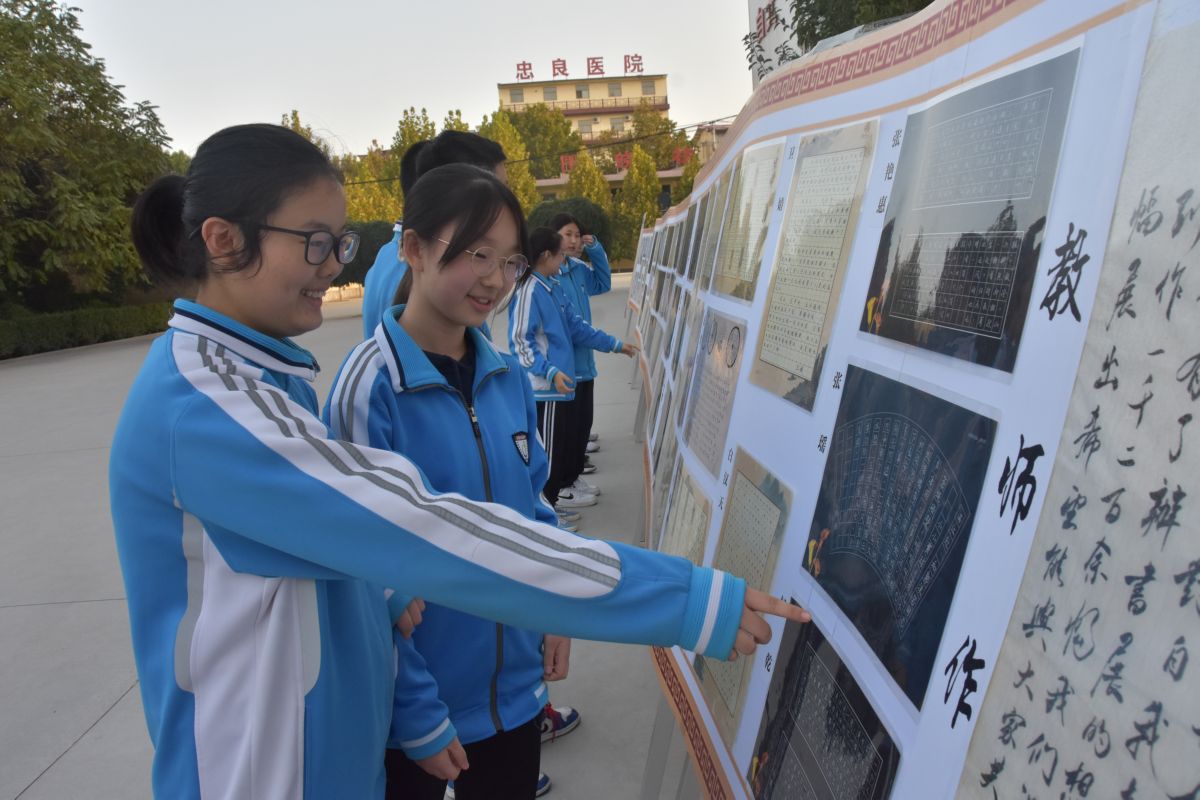 近日,运城市实验中学校园内,几名学生在观看校园书法展。