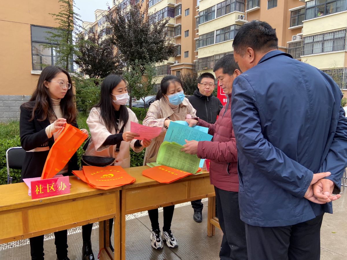 ▲近日,闻喜县银光社区工作人员在辖区东昇家园扶贫安置点,向居民宣传帮扶政策。