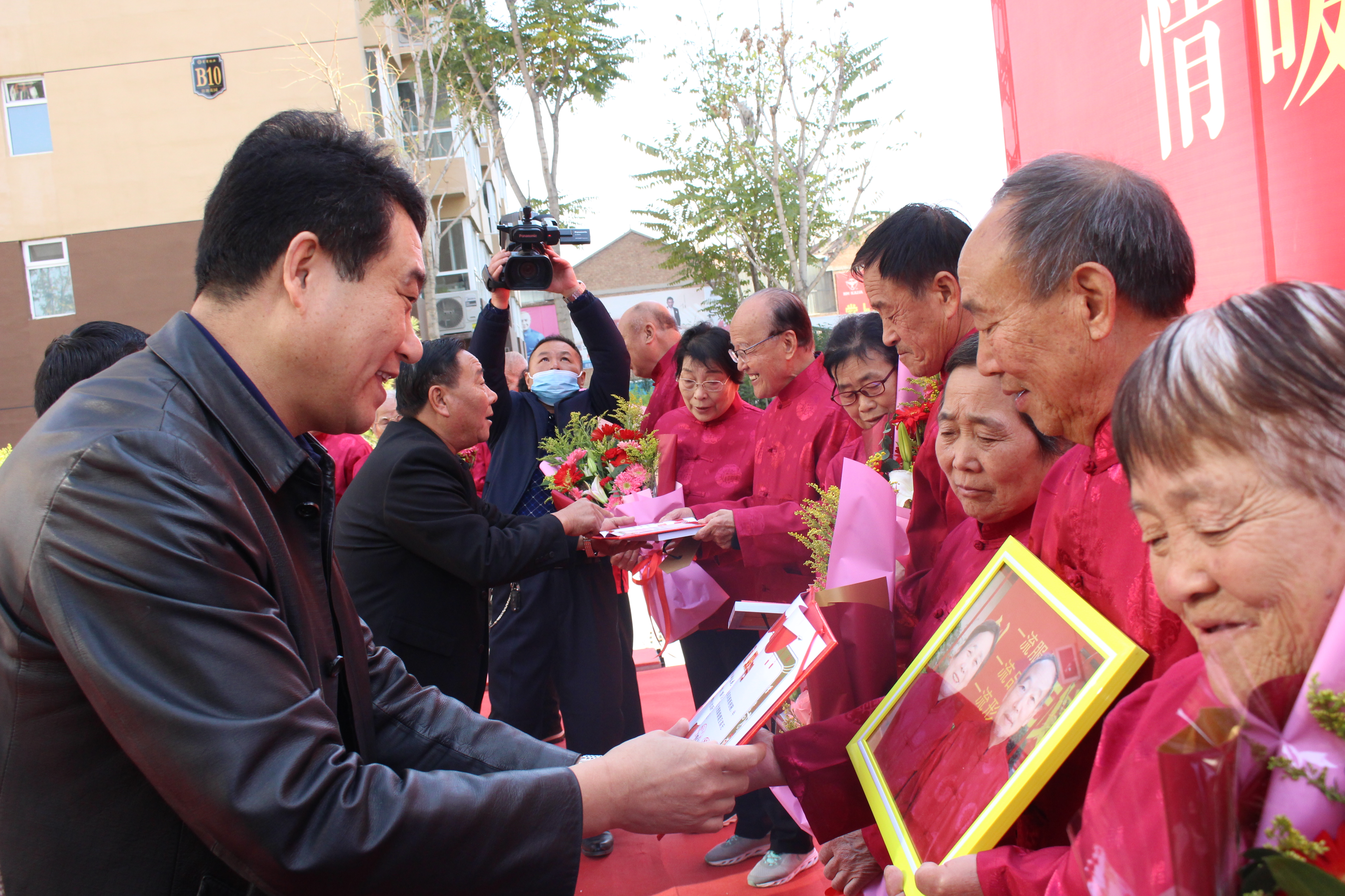 10月23日,闻喜县社区办党委书记、主任张广远等为13对金婚老人送上鲜花、金婚证书和精美相框,与老人共同欢度重阳佳节。