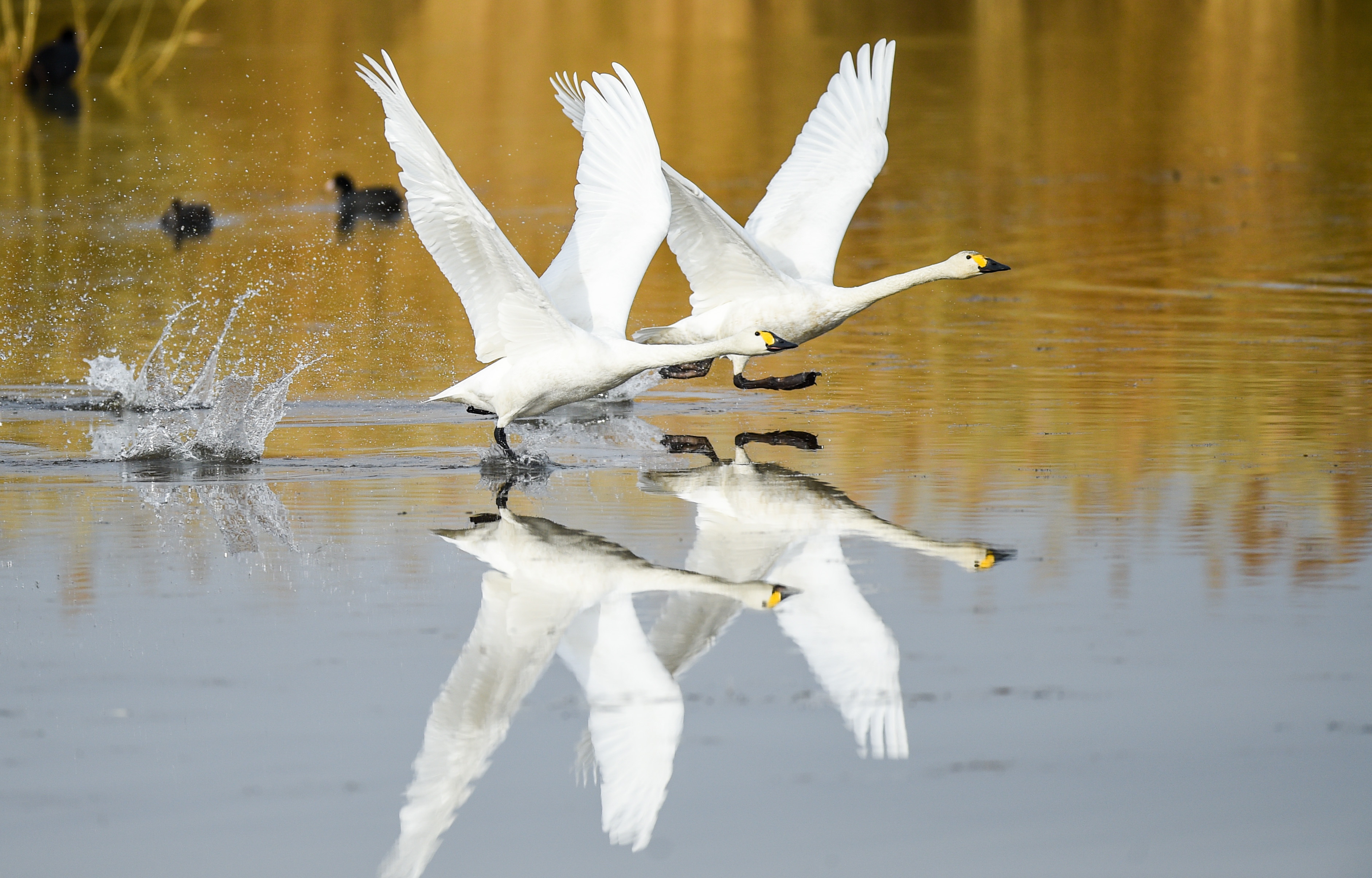 10月28日,天鹅在乌梁素海水面上嬉戏。