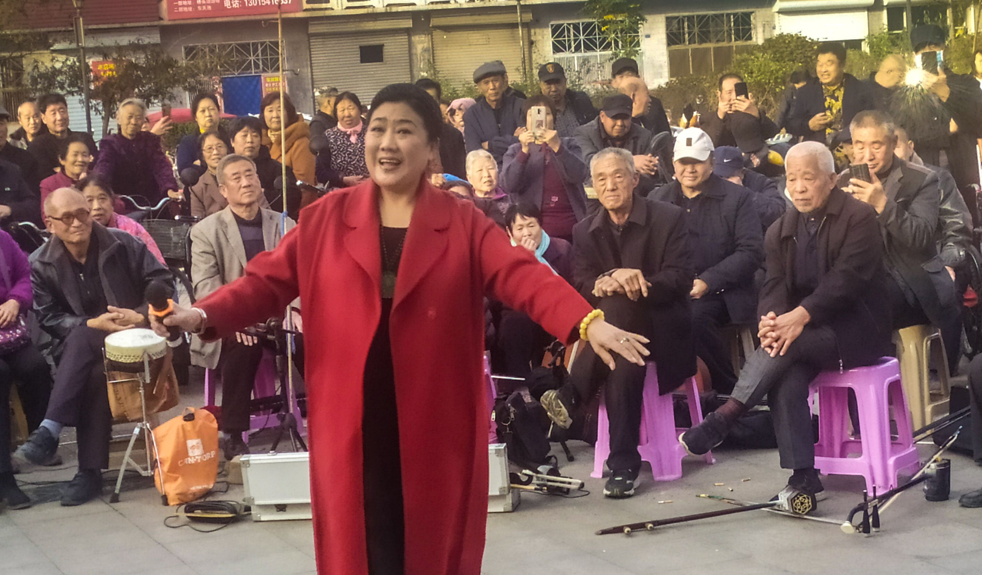 ▲11月1日,在新绛县东天池广场,著名蒲剧表演艺术家武俊英,为家乡蒲剧爱好者送戏,演唱了《滴血的母爱》等蒲剧选段,500余名戏迷观看了精彩演出,现场鼓乐声、演唱声、鼓掌声、叫好声接连不断。武俊英演唱完后,观众仍然意犹未尽,久久不愿离去。随后,她带领运城市戏迷协会的部分演员,为观众演唱了经典蒲剧选段。 卫世新 摄