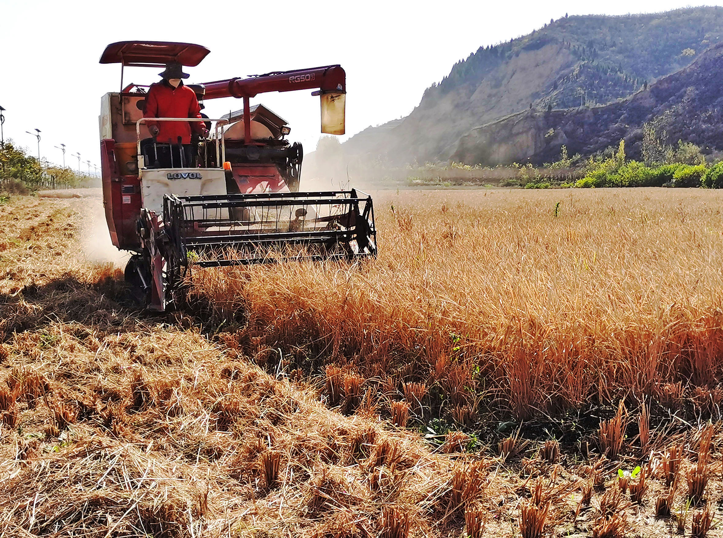 11月2日,垣曲县西王茅村,收割机在田间收割水稻。