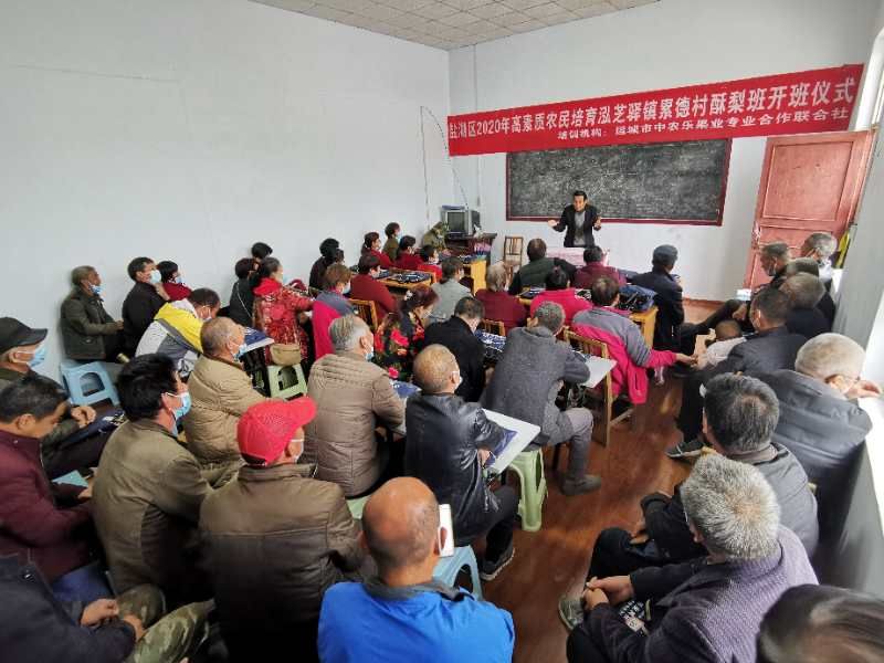 ▲近日,在盐湖区泓芝驿镇累德村举办的盐湖区2020年高素质农民培训班上,果农们在认真听讲。