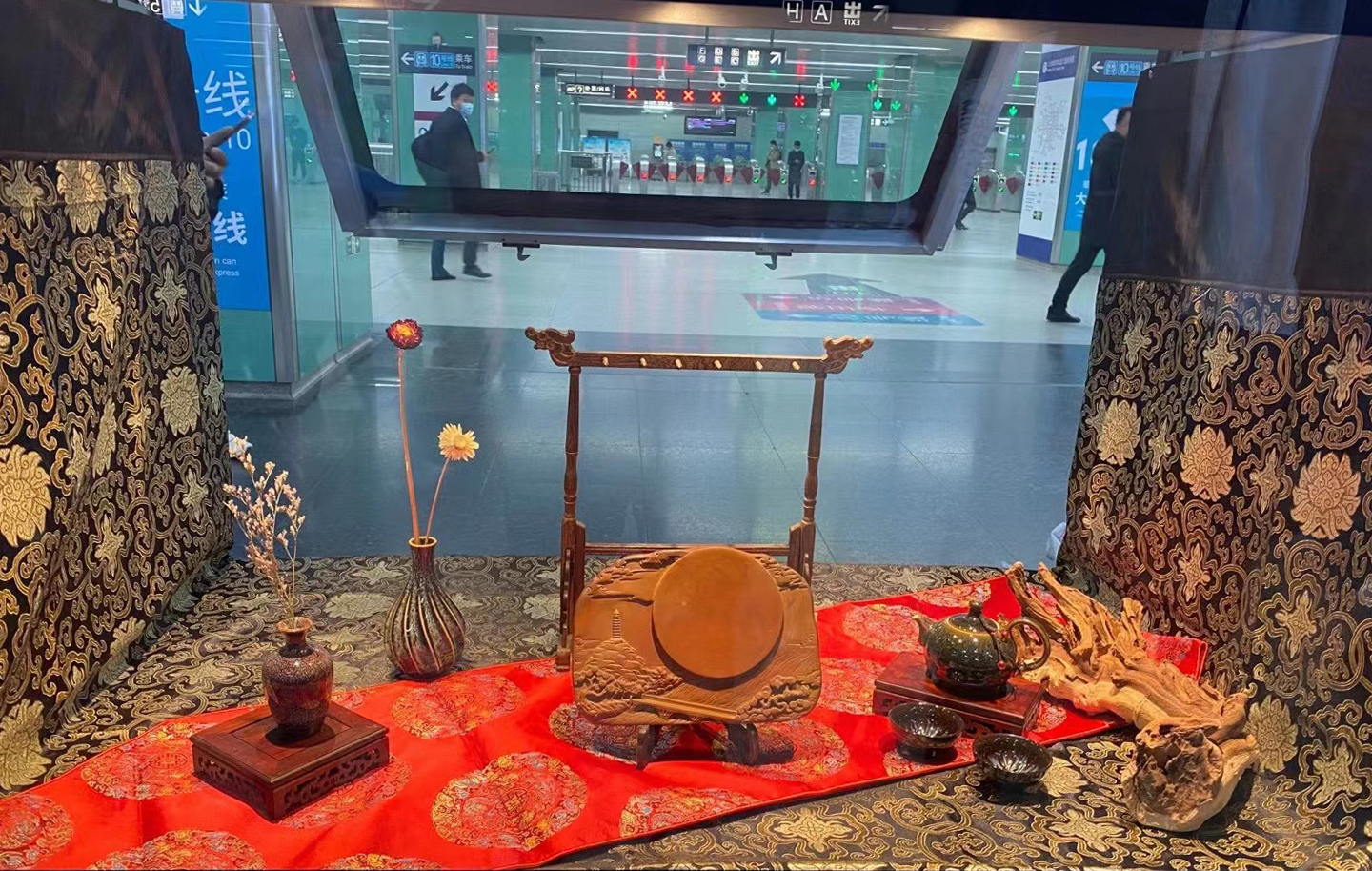 经过一个月的精心准备和砚台挑选,经审核通过,10月23日,新绛县绛州澄泥砚研制所所长助理、绛州澄泥砚第三代传承人蔺子麟与副主任李文斌历时8天完成展柜布置。“红色系列”砚、“云水系列”砚以及获国际大奖的精品砚以“砚”为媒,让来往的过客充分感受到山西深厚的历史文化底蕴,也借之传递出山西文旅融合发展的新气象。