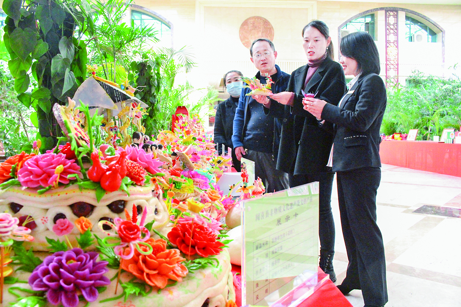 11月4日,群众在闻喜县非物质文化遗产及文创产品展暨脱贫攻坚“高手在民间”乡土文化能人技艺展现场参观。 本次展览是该县“新时代 家国情”家风家教系列文化活动之一,共展出闻喜花馍、草编、根雕、煮饼、杜仲茶、金丝皇菊、桑叶茶及工艺玻璃、陶瓷等20余种非遗及文创产品。展览不仅有当地群众参观,还吸引了不少外地客人,很多人拿着手机拍照、录视频,发微信朋友圈、发抖音,扩大了闻喜文化产品的影响力。(特约摄影 刘佳)