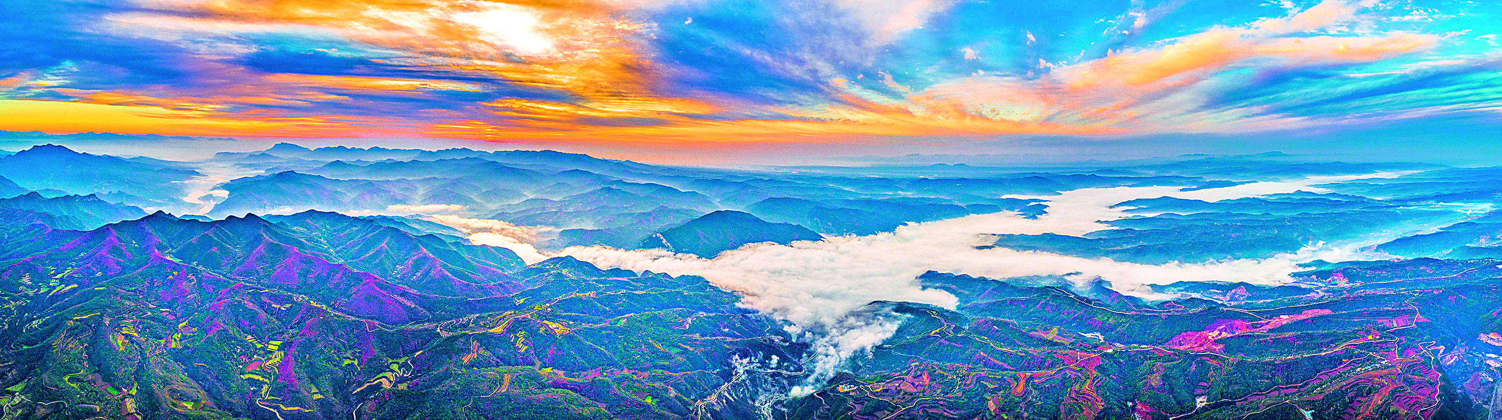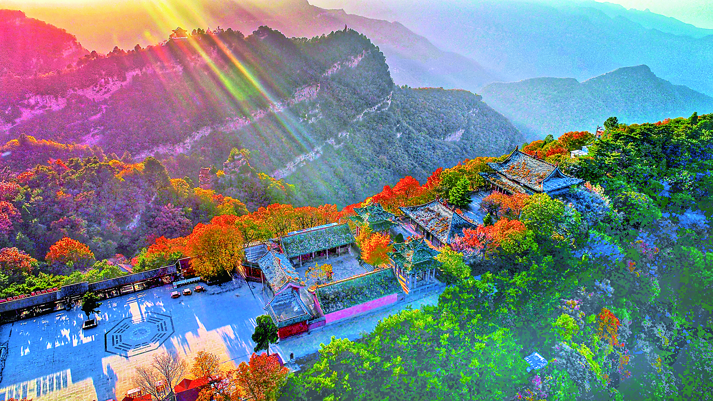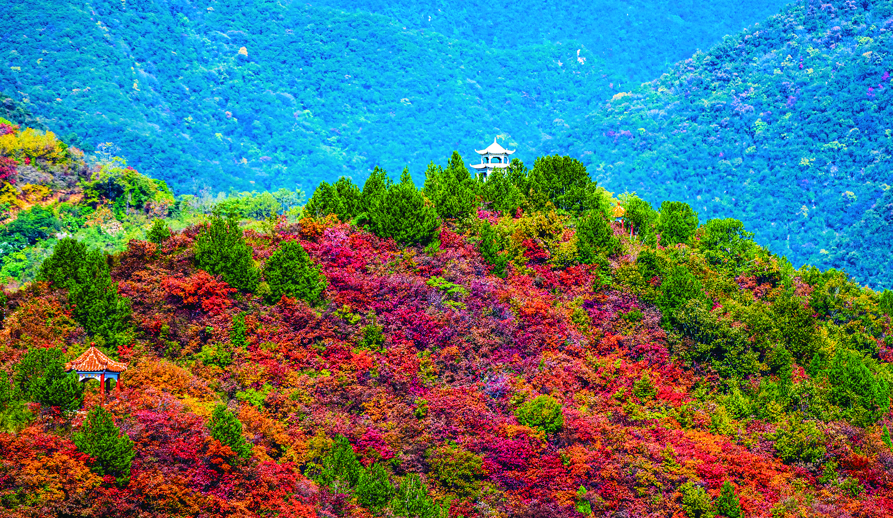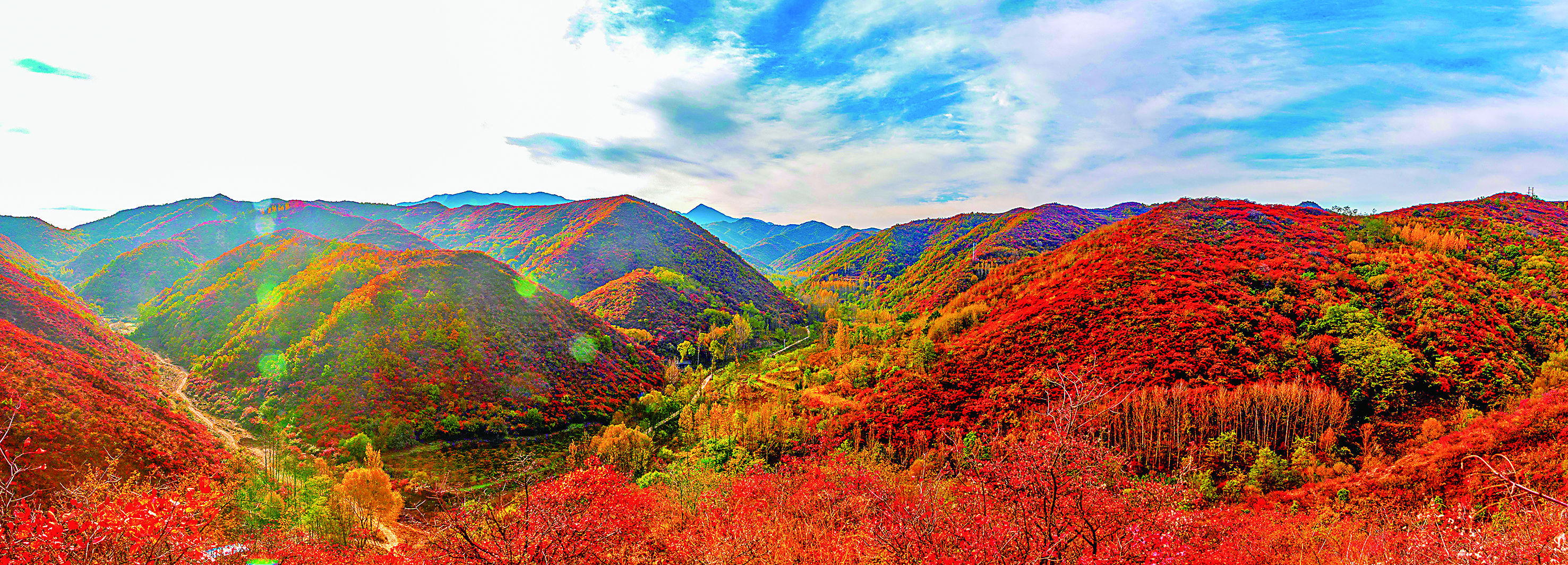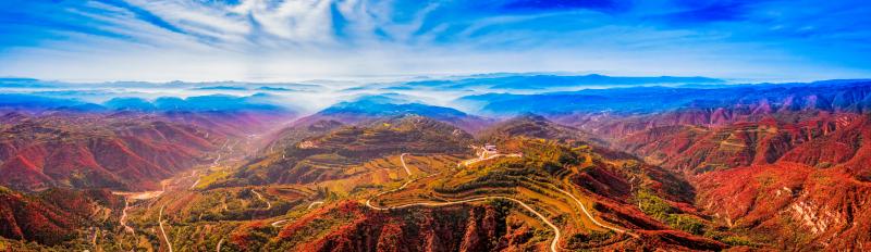深秋的河东,天高云淡,层林尽染,呈现出迷人的秋景。远眺山峦起伏,漫山遍野的红叶,间伴金黄和翠绿,色彩烂漫,仿佛一幅五彩斑斓的画卷。