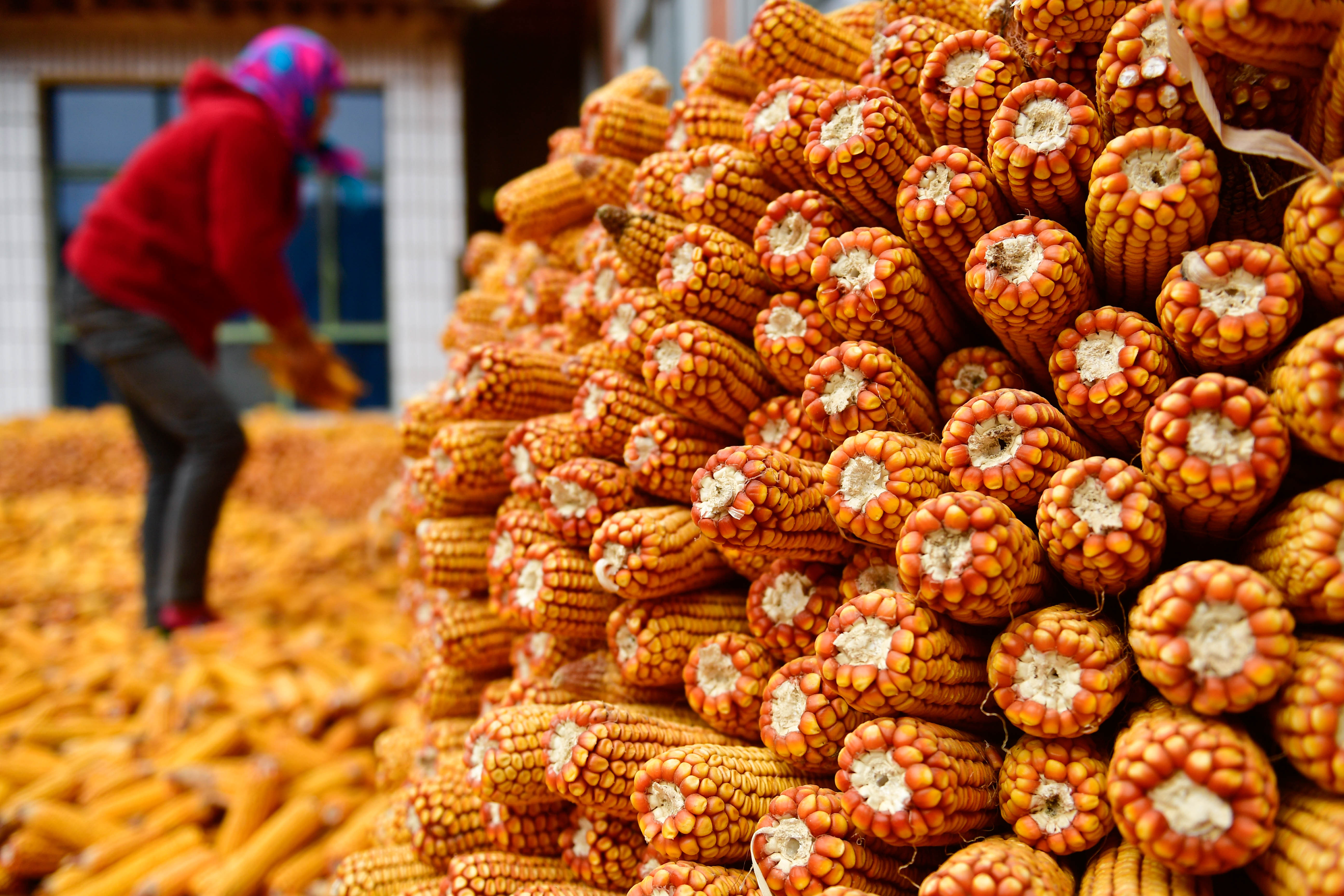 11月8日,在青海省海东市民和回族土族自治县转导乡前坪村,村民在庭院里晾晒玉米。近日,海东市民和回族土族自治县转导乡的三万亩全膜玉米进入收获季,农民利用晴好天气抓紧晾晒、脱粒、粉碎,制作青饲料,同时对收割后的田地进行覆膜保墒工作,田间地头一派繁忙景象。 新华社记者 张 龙 摄