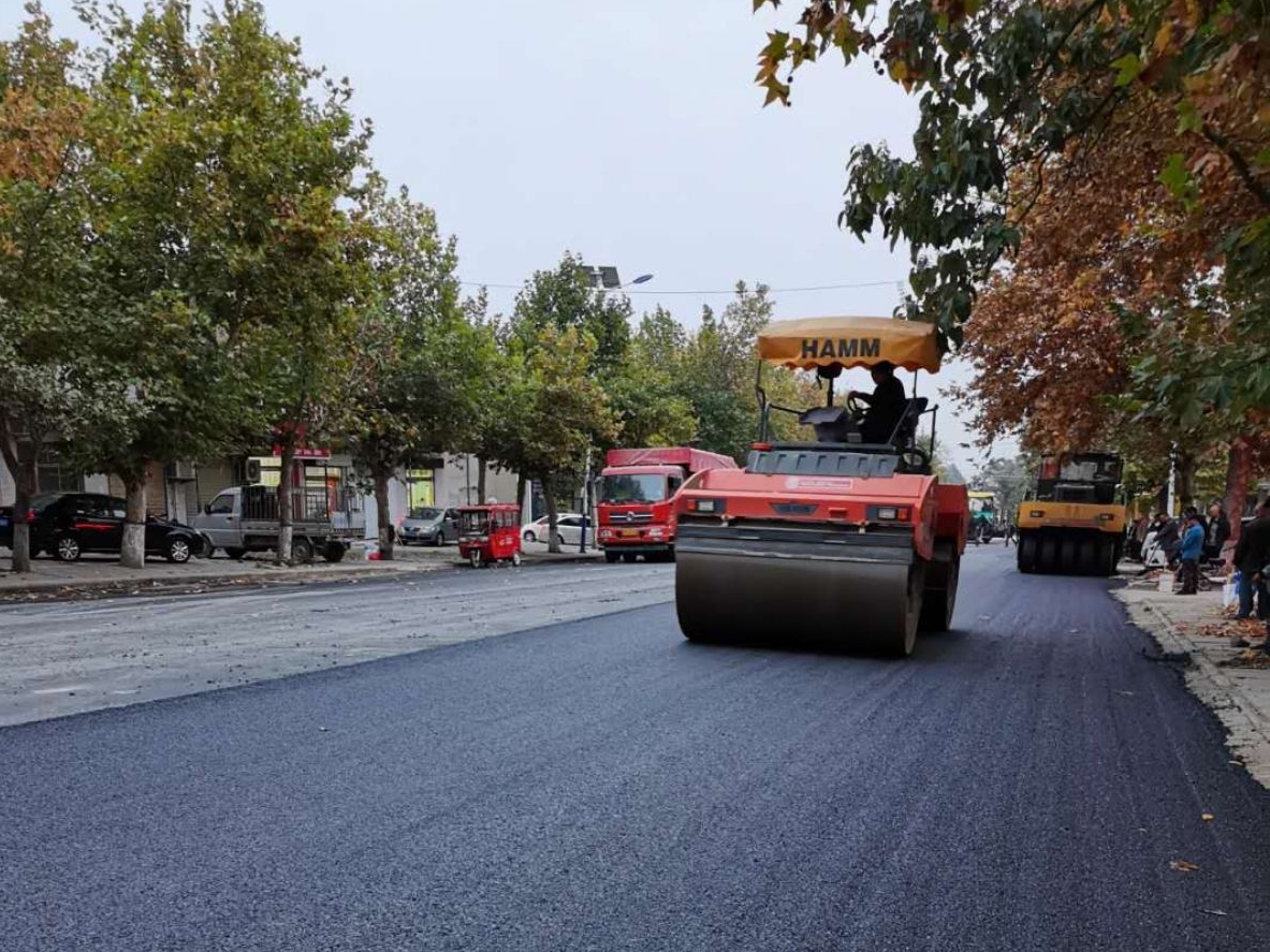 ▲近日,芮城县大王镇中心的南北大道改造提升工程加紧铺油。