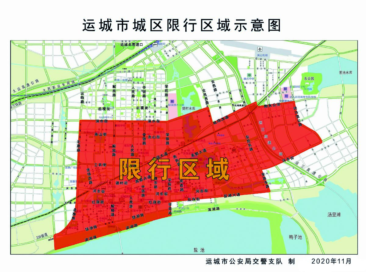 限行区域为市区圣惠路(不含)以东,涑水街(不含)以南,安邑西路北段(不含)向东与机场大道(不含)、司马温公路(不含)合围区域以西,滨湖大道及红旗东街延长线(不含)以北道路范围内。