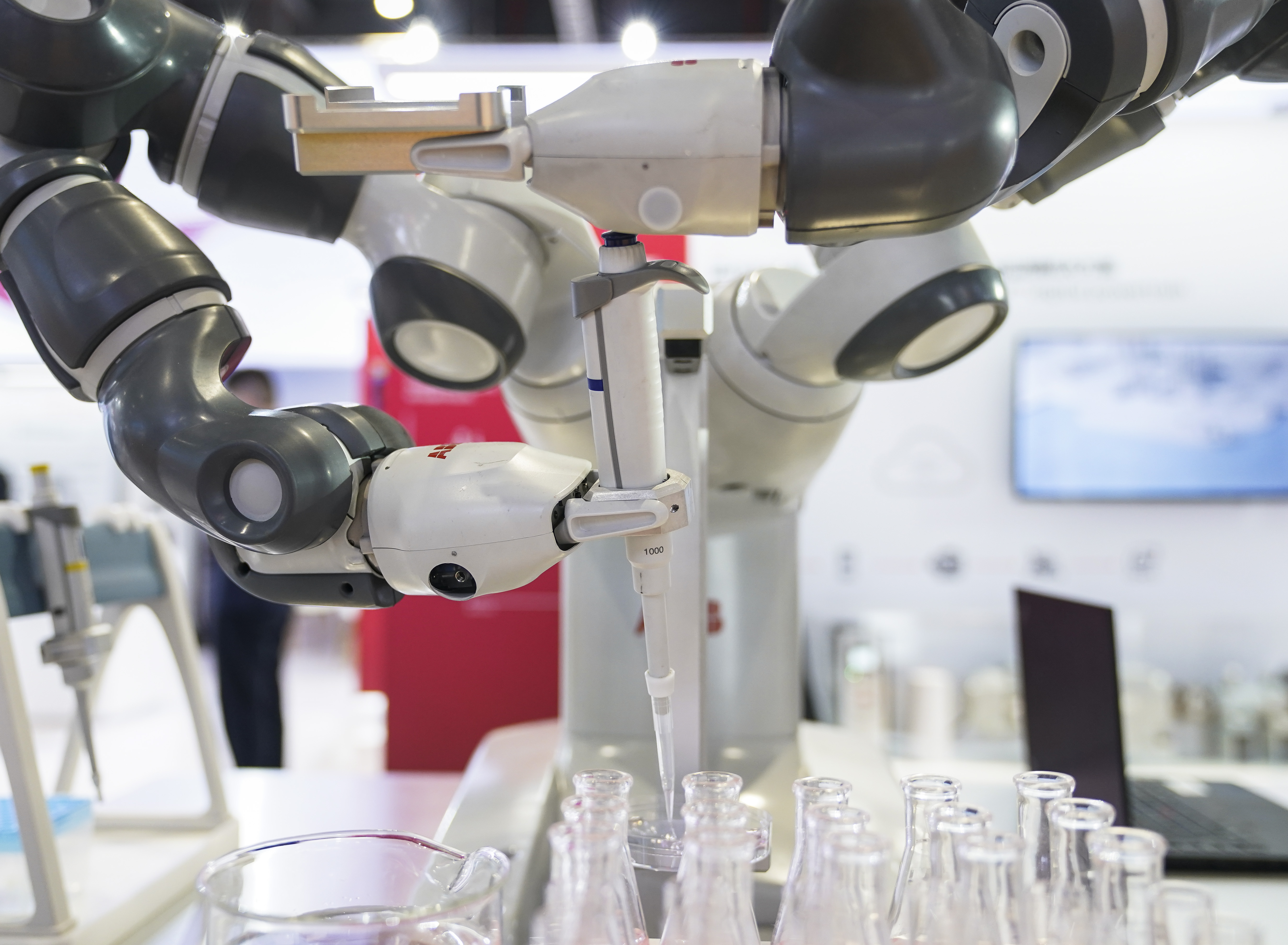 11月9日,在技术装备展区ABB展台,YuMi实验室预处理单元通过机械手进行操作。