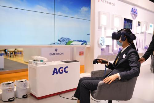 ◀11月10日,在进博会技术装备展区,一位女士在AGC展台体验VR产品。