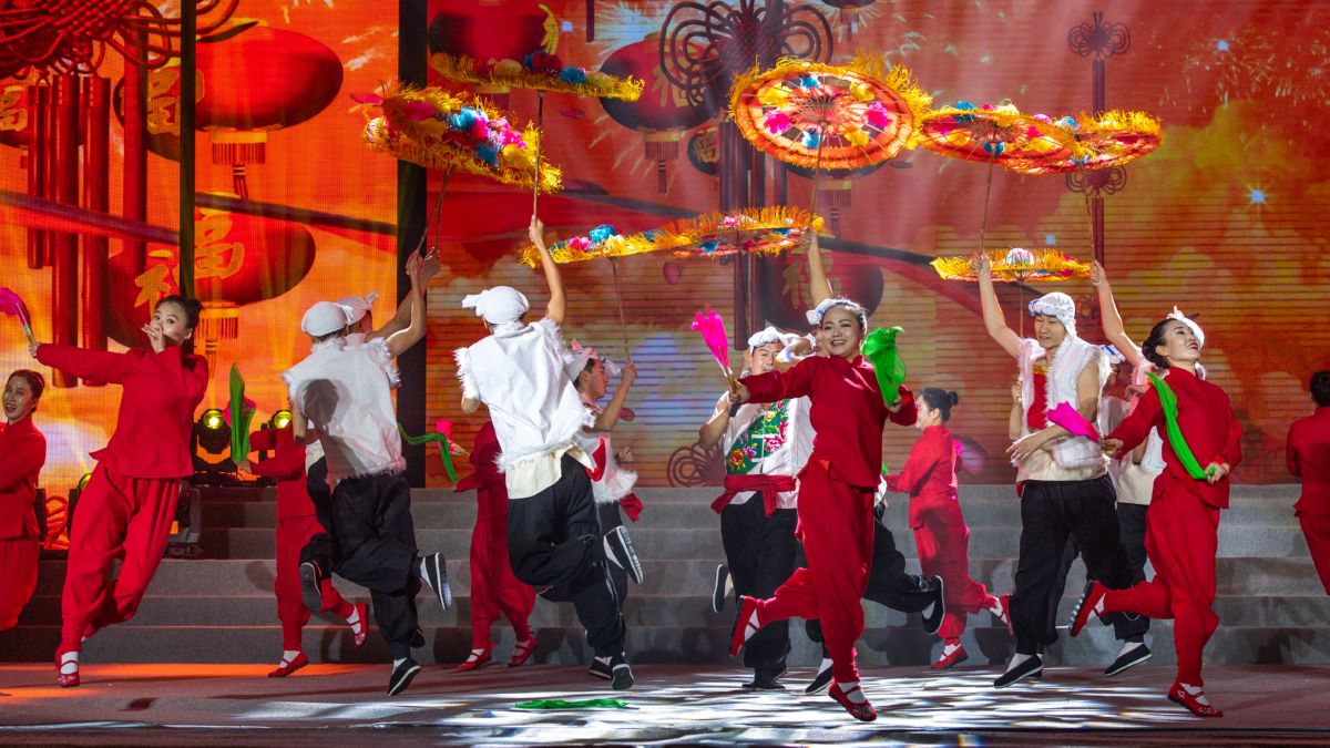 ▲临猗县选送的歌伴舞《红红的伞头火起来》