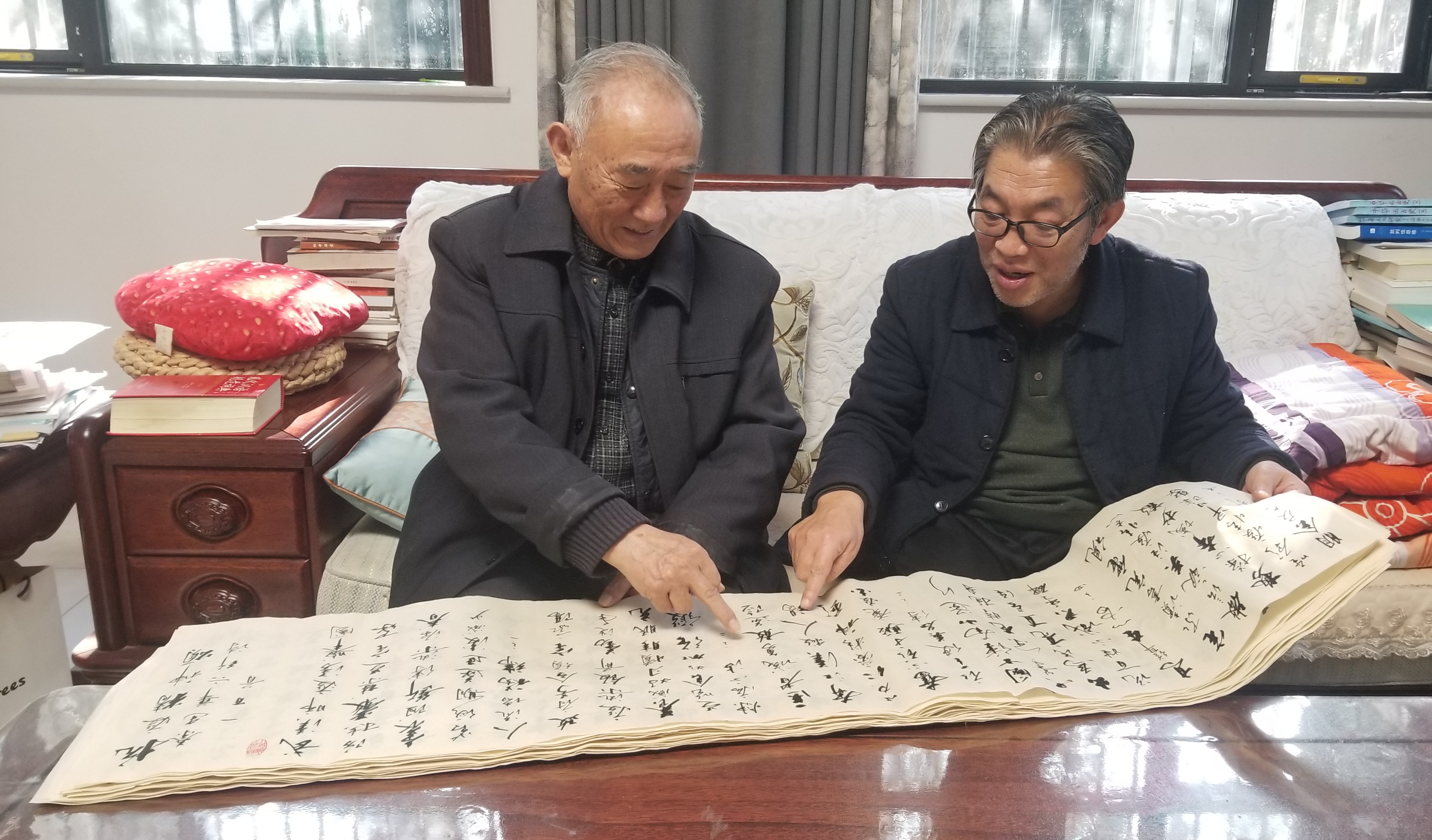 ▲张泽全(左)和秦建华一起欣赏书法长卷 范楚乔 摄