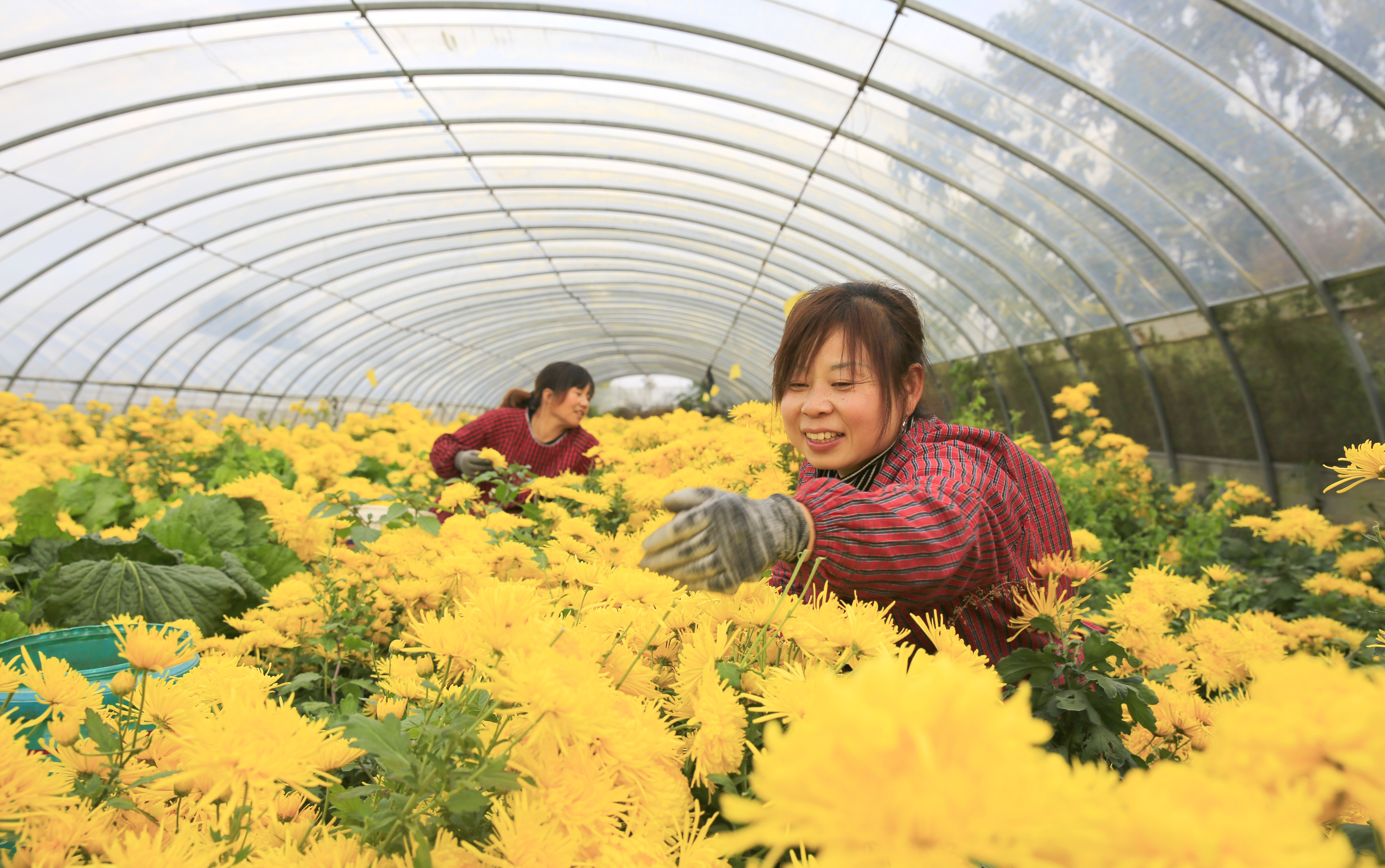 ▲近日,芮城县学张乡菊花种植基地的菊农在采摘金丝皇菊。