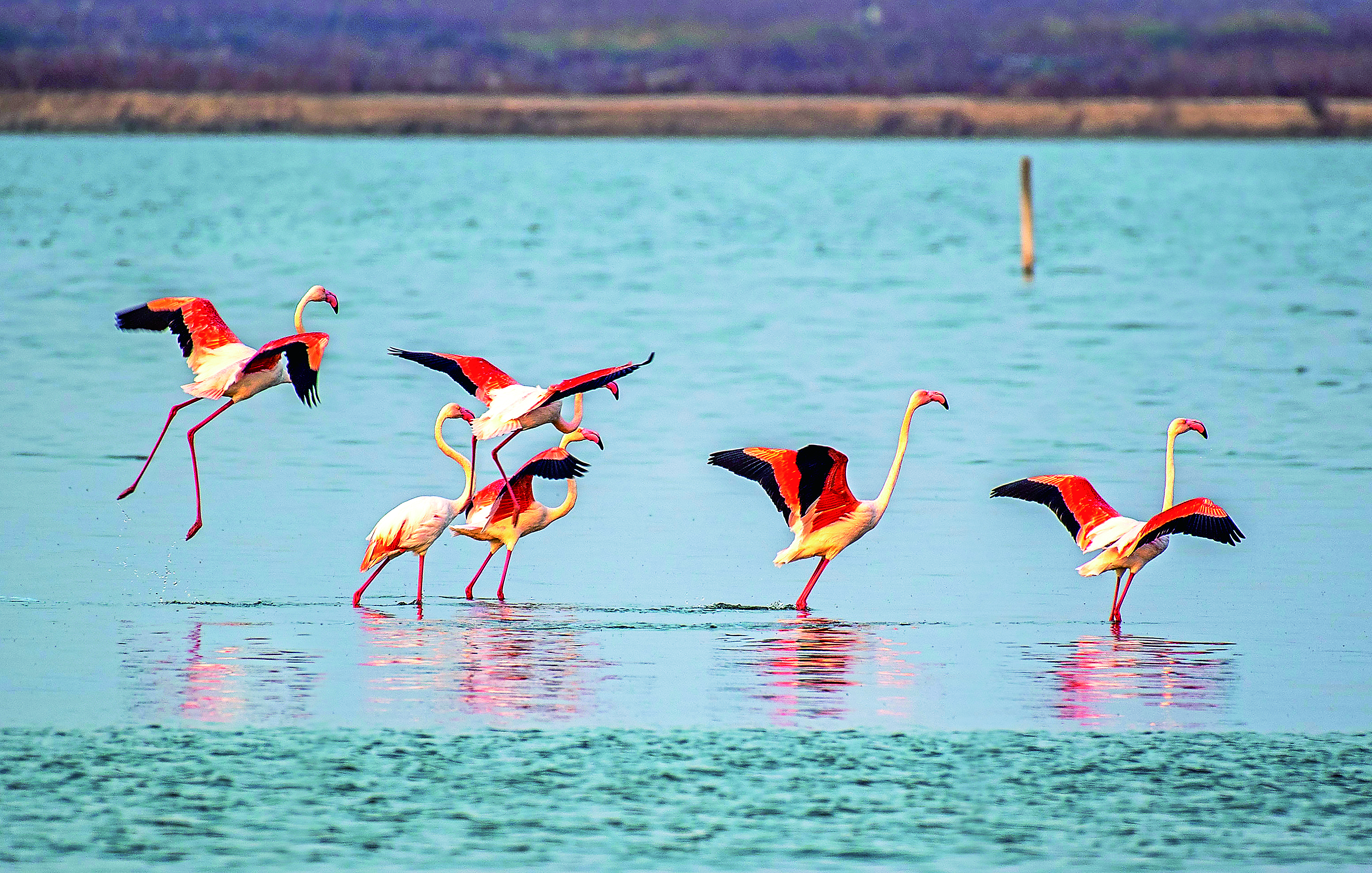 11月15日,6只火烈鸟在运城盐湖嬉戏。
