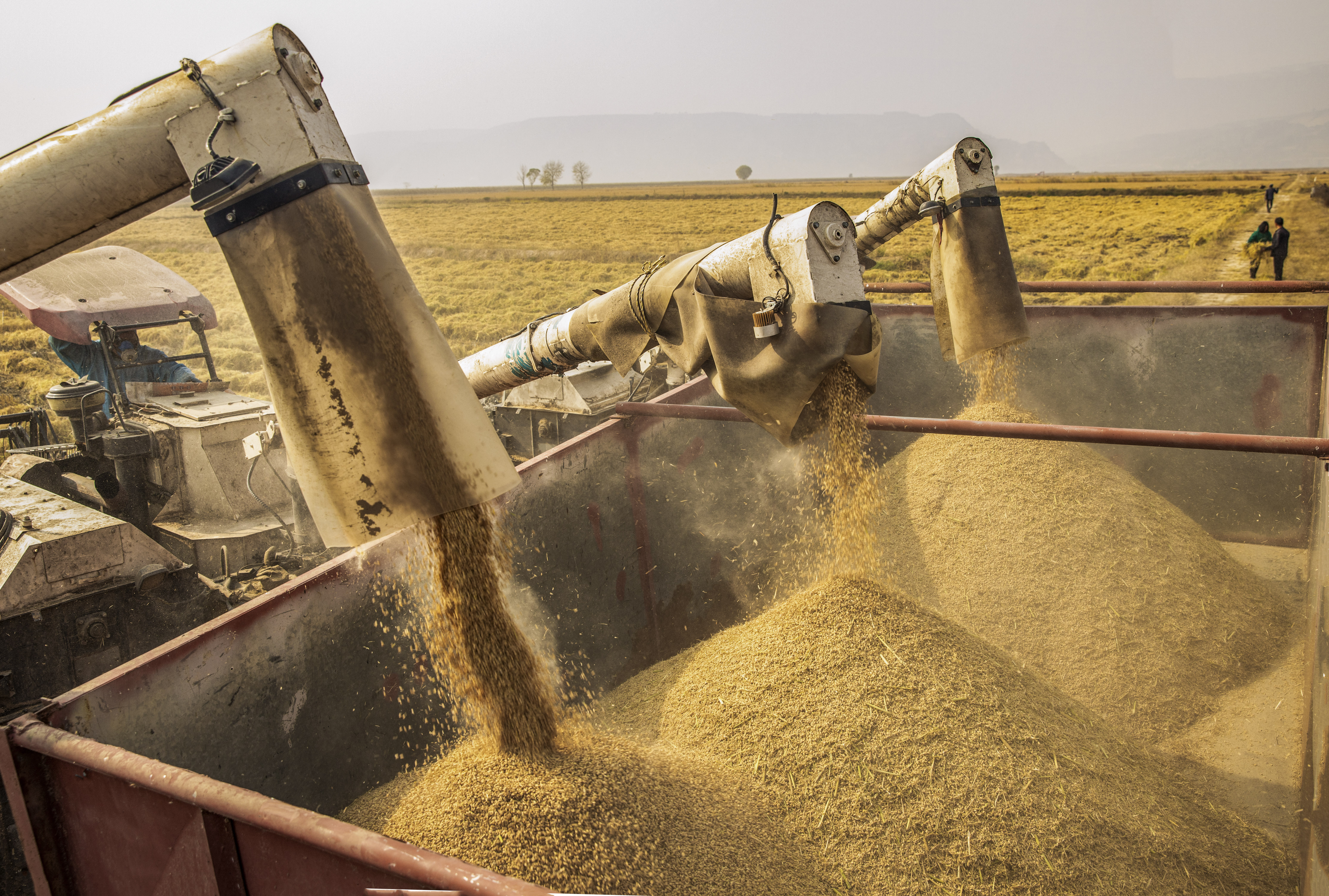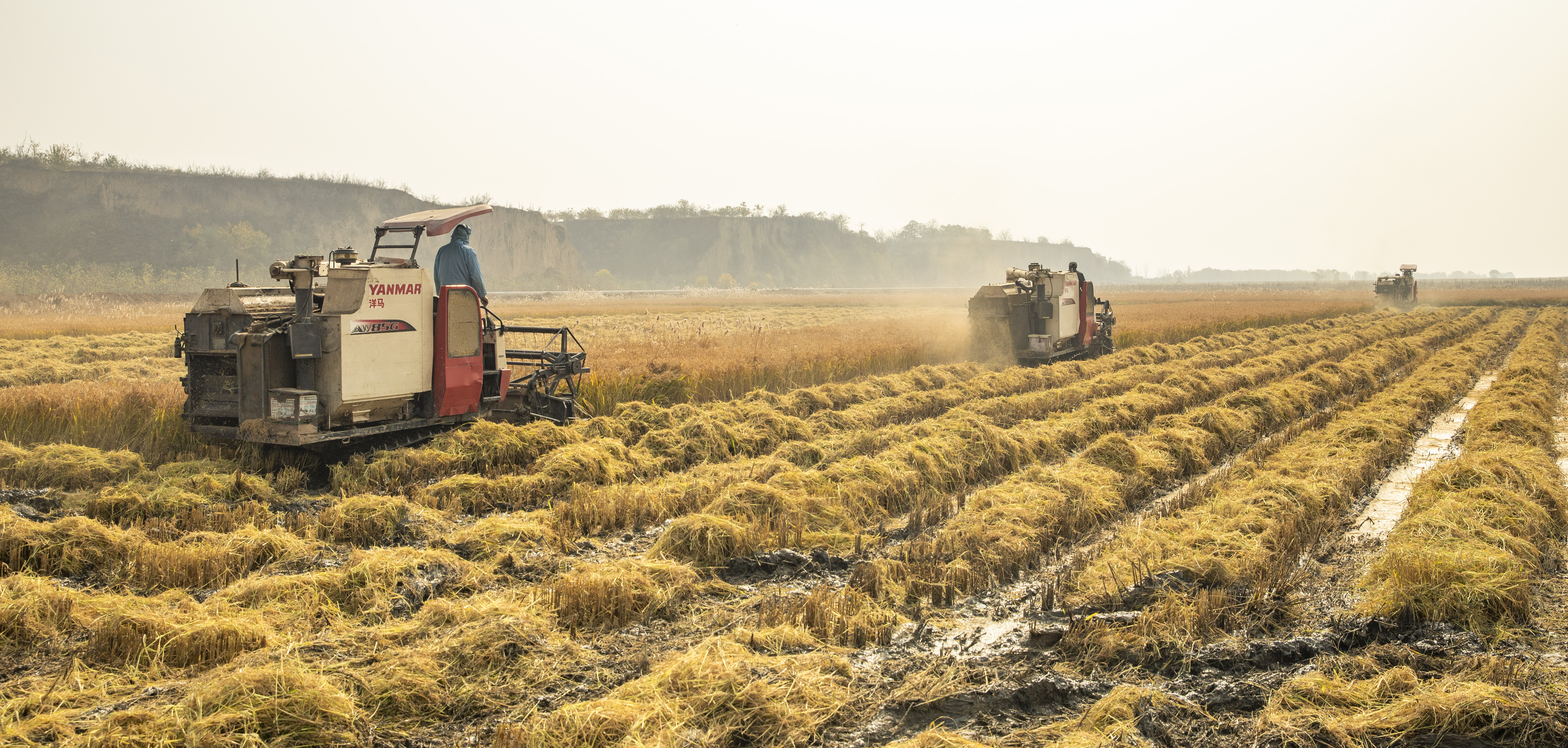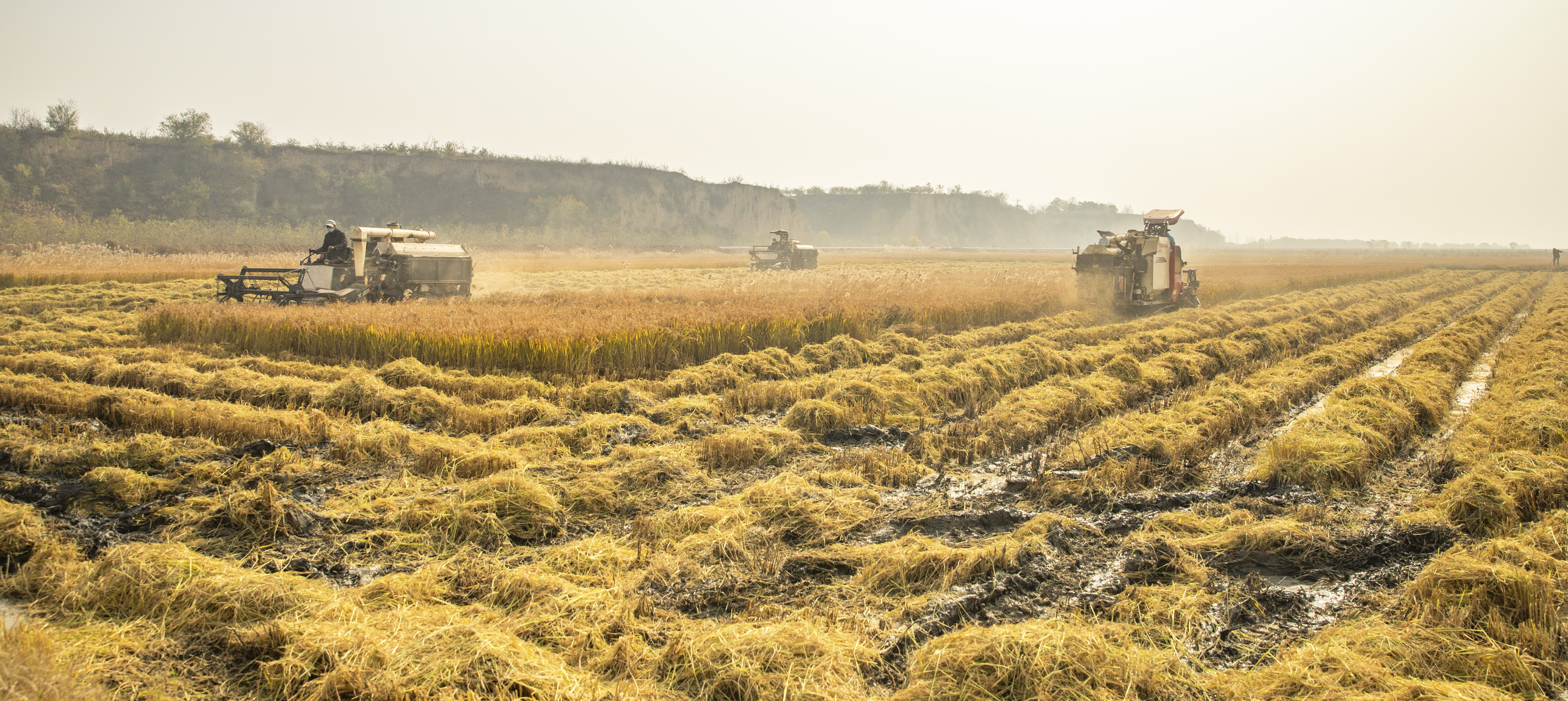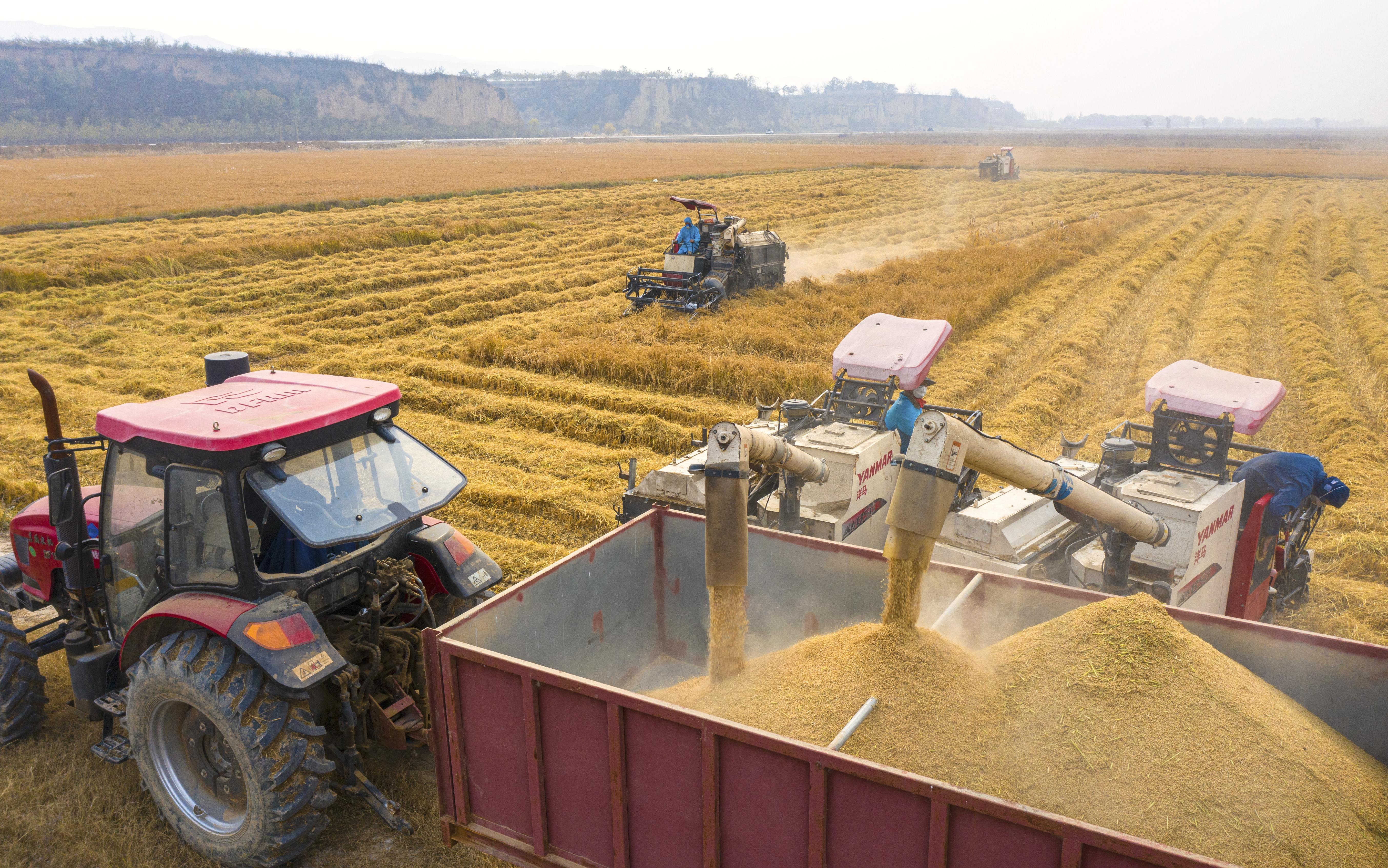 11月13日,地处黄河岸边的临猗县孙吉镇南赵村,今年万亩水稻又喜获丰收。金灿灿的稻田翻着稻浪,一串串饱满的稻穗令人陶醉。收割机穿梭在稻田中,一派繁忙的丰收景象。 特约摄影 杨建峰