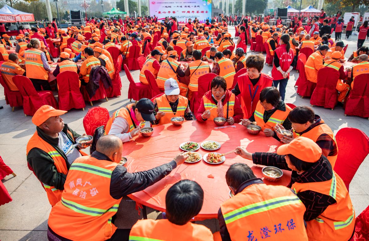 11月15日,在市区南风广场,运城市第一时间志愿者协会邀请环卫工吃饺子,为他们送去冬日里的温暖。