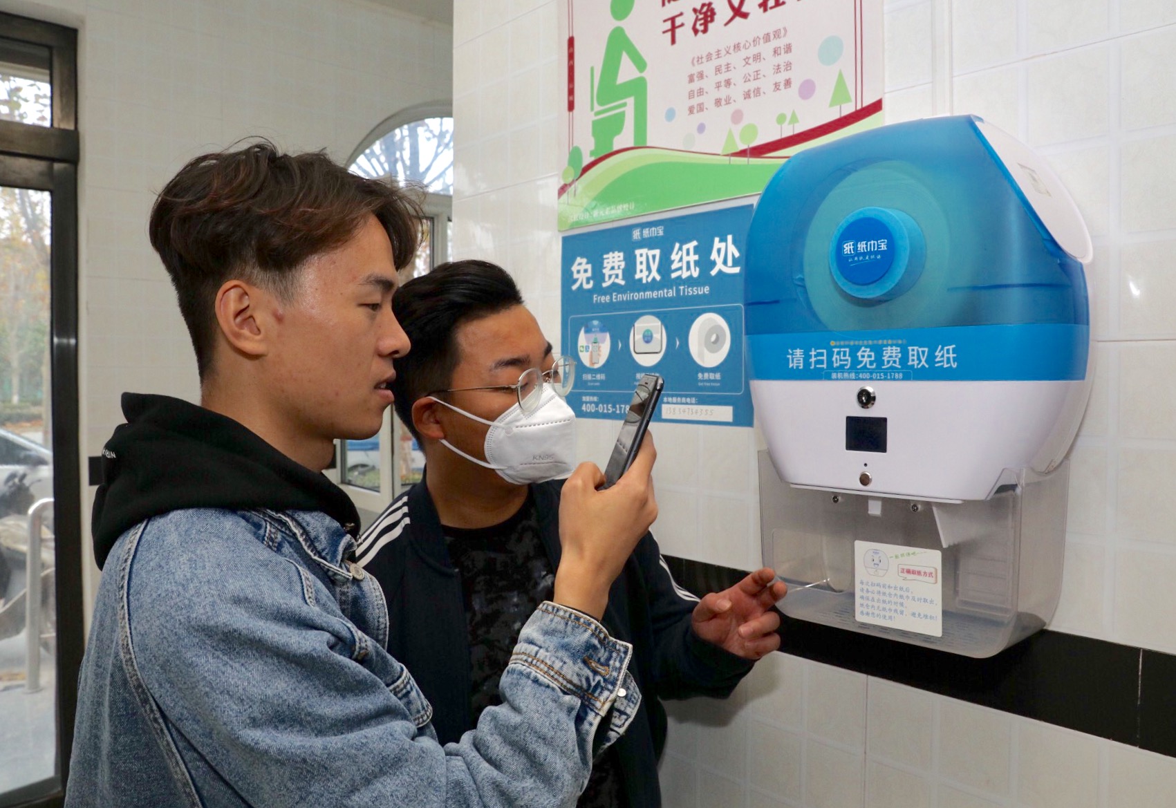 11月15日,市民在市区铺安街一公厕内,扫码领取免费纸巾。记者 祁克宁 摄