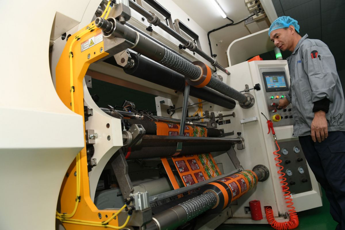 11月16日,位于稷山经济技术开发区的山西兆龙新材料科技有限公司工人在生产食品包装袋。
